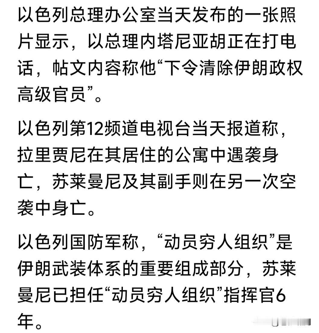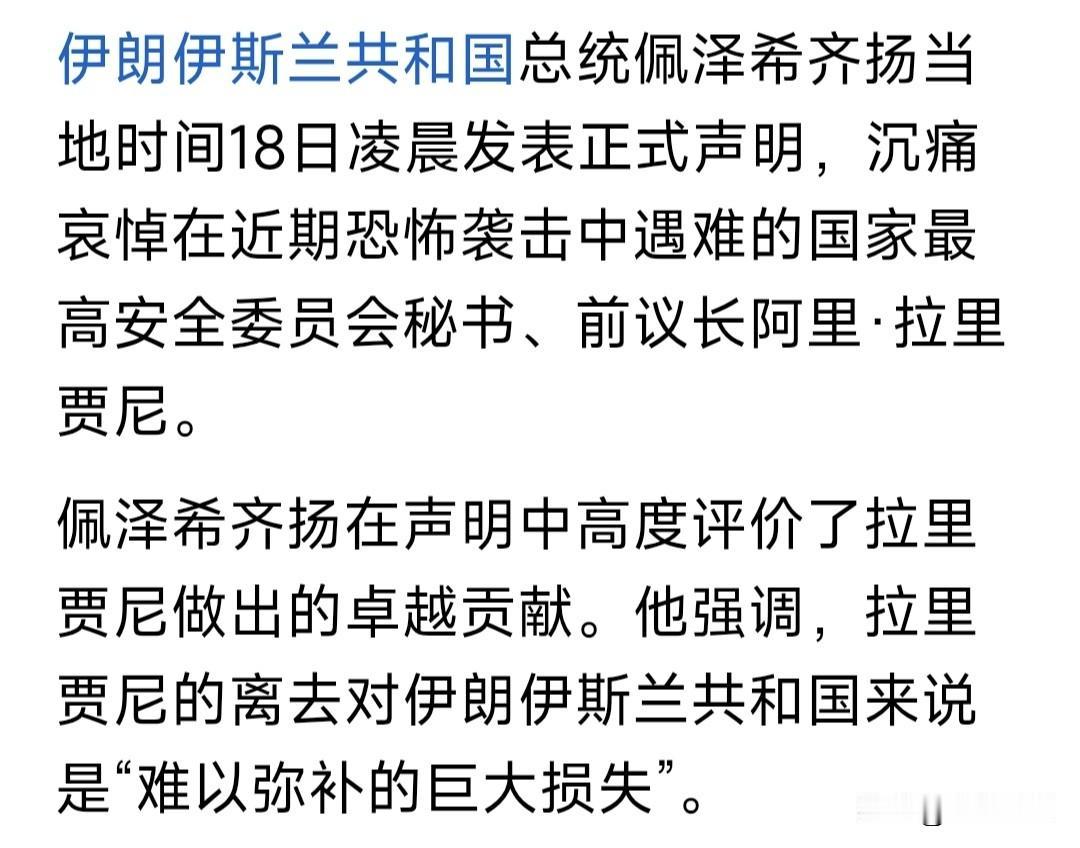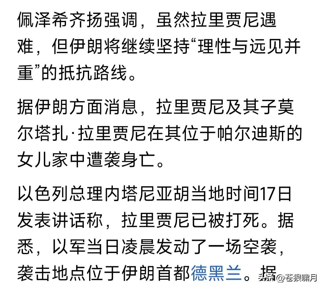 以色列再次精准“斩首”,清除伊朗强硬派核心人物拉里贾尼,“巴斯基民兵”正副指挥官,对美以伊冲突影响几何? 拉里贾尼何许人?伊朗“最高安全委员会”秘书,哈梅内伊高级顾问。哈氏身亡后,成为强硬派核心人物,权力超过总统佩泽,是穆杰塔巴最得力助手! “巴斯基民兵”什么组织?伊朗准武装组织,协助革命卫队控制局面。据说年前镇压反对派,即该组织所为。成员多系社会底层,被称为“动员穷人组织”。 不说这些了,只说以色列“斩首”拉里贾尼与“巴斯基民兵”正副司令,对美以伊冲突影响几何?肯定有影响,但也不尽然,据说伊朗每个重要职务,都安排有234顺位接替者,如何“清除”得完? 关键是美以伊冲突,受伤害最大的老百姓。美以已摧毁伊朗空防力量,海军也遭受巨大损失,经济几乎完全停摆,民众生活受到极大影响。何时能了? 出于对国计民生考虑,还是及早停战谈判的好!不知如此乱局之下,总统佩泽能否说服穆杰塔巴,与美以开始谈判,救民于水火,国家重回稳定局面? …………
