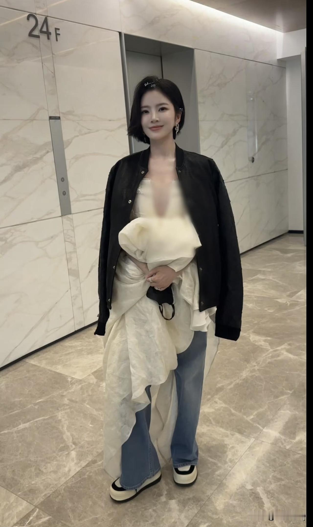 秦海璐这丸子头也太减龄了吧!✨高扎丸子头搭配叠穿T恤,休闲又时髦,笑起来温柔又