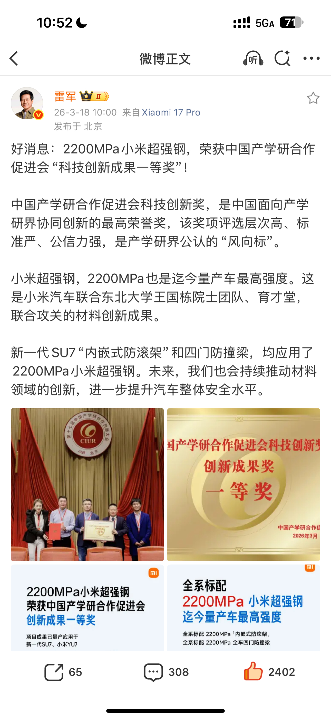 小米超强钢获得国家级科技一等奖作为小米YU7车主,看到这个消息真的太踏实了,小米2200MPa超强钢,直接拿下中国产学研合作促进会科技创新成果一等奖,含金量直接拉满。