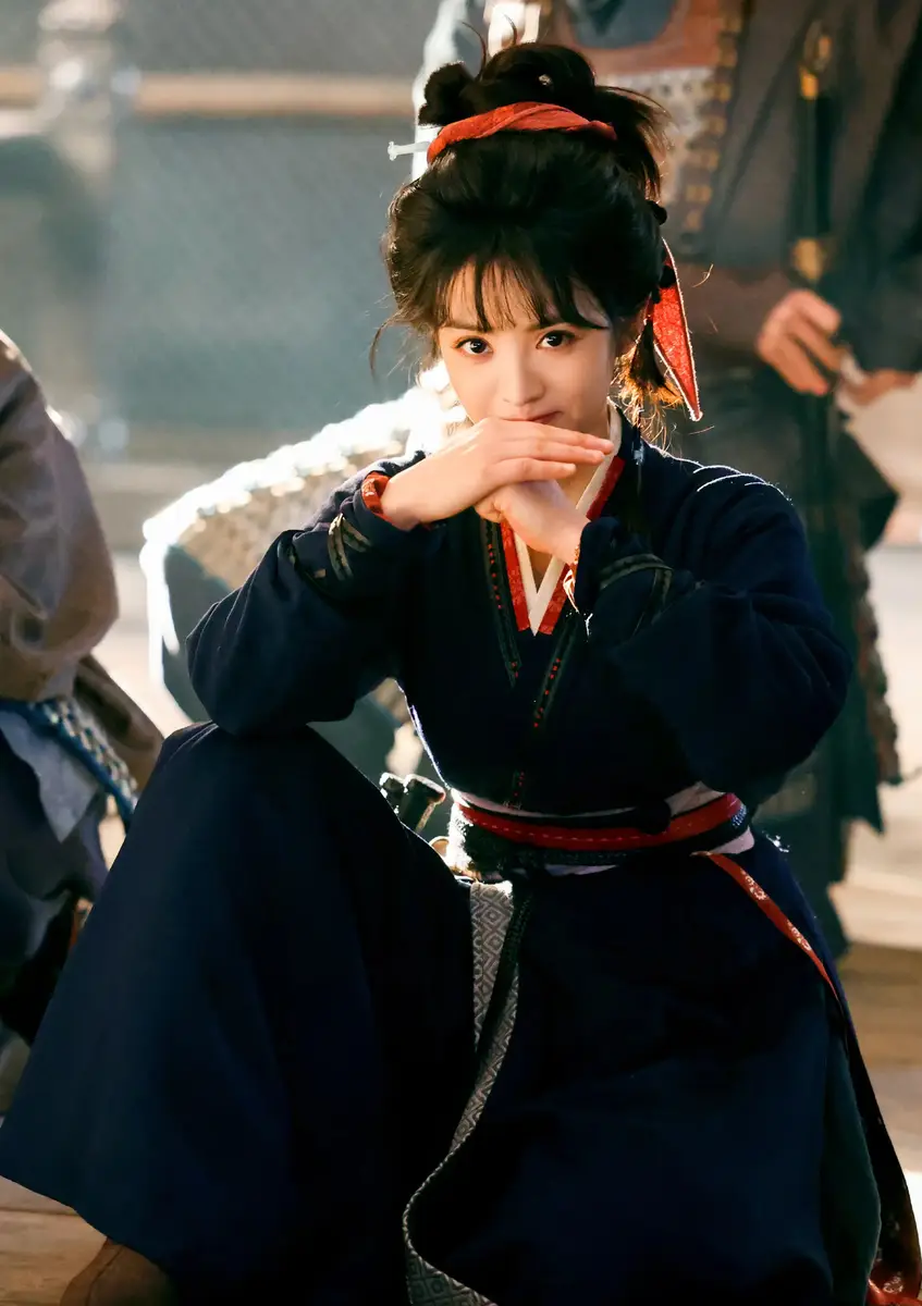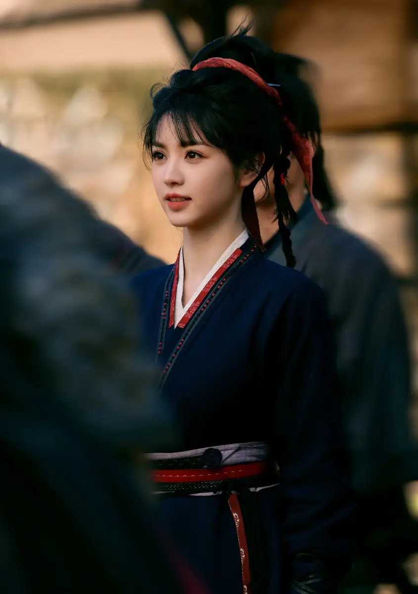 田曦薇穿藏青侠女裙利落飒爽 红绸带束发显英气灵动
