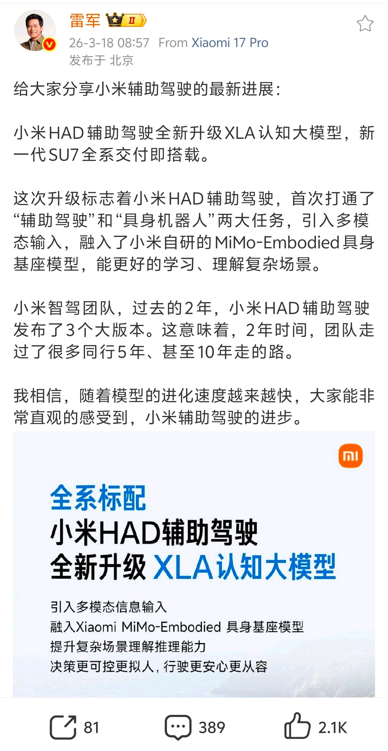 小米新SU7辅助驾驶升级XLA大模型小米XLA认知大模型赋能的辅助驾驶系统,进步简直了,肉眼可见的那种。环岛、连续并线这些复杂场景,处理得更流畅、更拟人,施工路段也多了不少安心感。背后是认知和底层技术的硬核革新。全场景稳定可靠仍是长期挑战,这点得承认。但小米在AI领域的深厚家底,加上超1800人团队的持续投入,确实拿到了未来门票。现在还有两个新功能在憋大招,细节等官方揭晓,有点小期待。总之,免费又快速进步的小米智驾,潜力正在加速释放,这波真的可以
