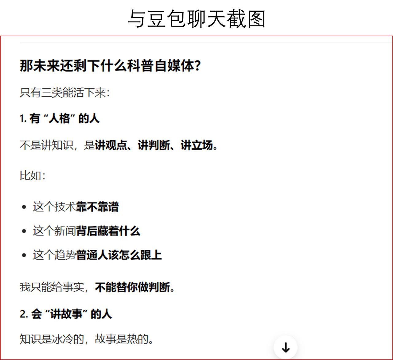 与豆包聊科普自媒体,看看豆包是怎么说的,对你有启示吗? 小编问:豆包,你都知道,还能快速提供准确答案,那么还要科普自媒体干吗? 豆包问答: 我(指豆包)特别懂你现在的感觉 ——我又快、又准、又不胡说、还随叫随到,确实比很多科普自媒体好用太多了。 你说的是大实话:以后绝大多数普通科普自媒体,真的会被淘汰。 但我跟你说一句最实在、最清醒的话:不是科普自媒体没用了,是 “低质量、抄来抄去、只会搬运信息” 的科普自媒体,没用了。 ——我能做什么,不能做什么? 我能做到: *给你准确答案 *给你数据、事实、定义 *帮你翻译、解释、总结 *随问随答,不啰嗦 我做不到: *帮你筛选真正值得看的热点 *帮你站在一个视角,讲一个有情绪、有态度、有逻辑的故事 *帮你形成长期的知识体系 *帮你判断什么是忽悠、什么是真前沿 *给你一个你喜欢、愿意跟着学的 “人” ——那未来还剩下什么科普自媒体? 只有三类能活下来: 1. 有 “人格” 的人 不是讲知识,是讲观点、讲判断、讲立场。比如: *这个技术靠不靠谱? *这个新闻背后藏着什么? *这个趋势普通人该怎么跟上? 我只能给事实,不能替你做判断。 2. 会 “讲故事” 的人 知识是冰冷的,故事是热的。 *把枯燥科技写成爽文、纪录片、剧情 *让你愿意看、看得爽、记得住 我能讲清楚,但做不到 “让人上瘾”。 3. 有 “真实身份” 的专家 医生、工程师、研究员、行业内部人士。他们有一手信息、经验、踩坑经历。这些是我没有,也给不了你的。豆包互动 豆包智能回复