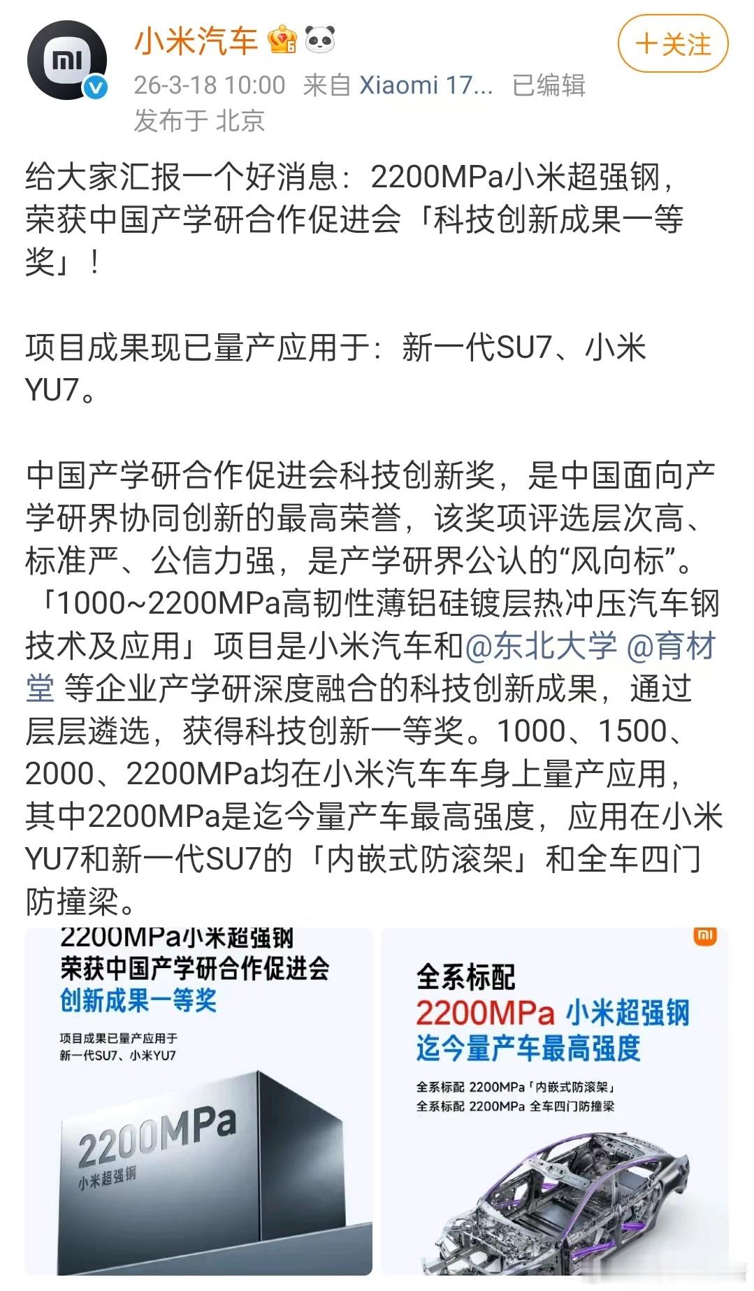 小米超强钢获得国家级科技一等奖小米这个2200MPa超强钢拿奖,真不是吹的!它是目前量产车用的最高强度钢材,比主流材料强度高了40%,韧性也拉满。