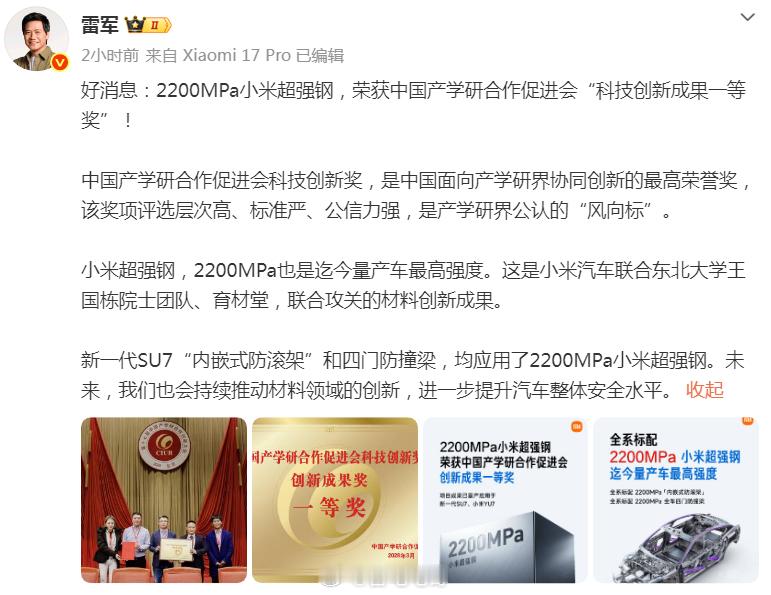 2200MPa小米超强钢,荣获中国产学研合作促进会“科技创新成果一等奖”