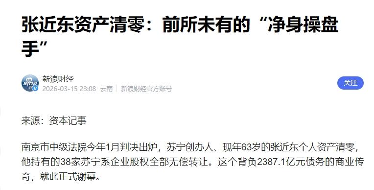 一早看到这个大新闻,前全国首富苏宁老板张近东1000多亿个人资产一夜清零。原来他为了偿还苏宁集团的公司债务,拿出了自己和家里所有的个人财产,包括股票、期权、房产、汽车,甚至全部收藏品也拿了出来。 法院的裁定书里写得明明白白,苏宁系总共欠了外面2387个亿,这就是你每天中五百万彩票,得连续中一百三十年才能凑齐。 面对这么一个天文数字的窟窿,张近东的选择,不是跑路,不是耍赖,更不是找一堆律师把自己撇干净,而是把自己和全家的老底,那超过1000个亿的个人资产,全都掏了出来,一把填了进去。 他名下所有的股票期权,全国各地的豪宅房产,车库里的那些名车,甚至是他压箱底的个人收藏,什么字画古董,只要能换成钱的,一件不留,全部拿去还债。 他把自己几十年打拼积攒下来的财富,彻彻底底地归零,用来给苏宁这艘快要沉没的大船续命,给所有债权人一个交代。 张近东绝对是个商业猛人,九十年代初,他就靠着在南京一个不起眼的小门面卖空调,硬生生杀出了一条血路,把苏宁做成了全国最大的家电连锁。 在那个实体为王的时代,他就是线下零售的神,但时代变了,互联网的浪潮打过来,谁都躲不掉。 苏宁的麻烦,就出在转型的十字路口上,面对淘宝、京东的线上攻势,张近东心里肯定急,但他没有选择收缩防守,保住自己的基本盘,反而选择了一条更烧钱、风险更高的扩张之路。 他觉得光靠卖电器不行,得搞多元化,得线上线下一起抓,于是我们看到他花大价钱买了国际米兰足球俱乐部,一脚跨进体育圈。 又大举进军房地产,想在黄金地段盖苏宁广场,线上呢,苏宁易购也没少砸钱,想跟电商巨头们掰掰手腕。 每一个都是吞金巨兽,需要持续不断地输血,当这些新业务没能像预想中那样快速带来回报,而主业家电零售又在不断被侵蚀的时候,资金链的断裂就成了必然。 苏宁的困局,根子就在于张近东自己的一系列战略误判,他想下一盘大棋,结果棋盘太大,把自己给困住了。 商业世界里,输赢很正常,判断失误栽跟头的大佬也不止他一个,但真正让人佩服的,是输了之后的姿态,这些年,咱们见过的“聪明”老板太多了。 公司一出问题,他们最先想的,就是怎么保全自己的财富,通过各种复杂的信托、离岸公司,早就把个人资产和公司债务划得清清楚楚,防火墙修得比谁都高。 公司破产就破产,反正我个人的钱一分不少,然后留下一堆烂摊子给员工、供应商和银行,更有甚者,直接脚底抹油,一句“下周回国”成了江湖传说。 张近东没有耍那些金融财技,没有给自己留后路,他选择了一种最笨拙,但也是最硬气的方式:我创办的企业,我做的决策,后果我来承担。 他用自己一生的财富,为自己的错误买了单,这笔钱,不仅仅是还给了债权人,更是维护了一个企业家最后的信誉和尊严。 信息来源:新浪财经