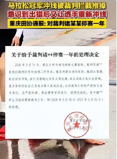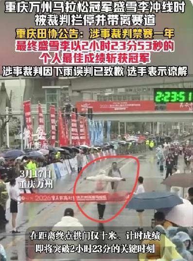 万州马拉松冠军冲刺却被裁判推走,回应称裁判的眼镜被雨水遮挡! 2026年3月15日,本来应该是云南楚雄选手盛雪李运动生涯里的一个高光时刻。在重庆万州环湖马拉松的赛道上,他一路领先,眼看就要以刷新个人最好成绩的姿态冲过终点线。然而,就在距离拱门仅剩十来米的关键时刻,一件让人瞠目结舌的事情发生了 。 当天的万州下着雨,赛道湿滑,工作人员都穿着雨衣。一名身穿白色雨衣的终点裁判突然冲进赛道,面对即将撞线的盛雪李,不仅没有挥手致意让其通过,反而做出了一个强硬的拦截动作,直接上手推搡,试图将他拉出赛道 。从直播画面和现场视频来看,盛雪李被这突如其来的一幕搞懵了,他明显放慢了脚步,身体姿态显示出抗拒和疑惑。裁判的动作相当坚决,似乎认定他是跑错了赛道的半马选手。盛雪李后来在自己的社交账号上无奈地调侃:“今天全马冲线,差点被裁判给抱走,第一次全马站台居然发生这样的乌龙,我也是服了” 。 实际上,现场广播已经播报了他的参赛号码,而且全马选手是白底号码布,半马是橘红底,辨识度很高 。尴尬的混乱持续了短短几秒,旁边的观众和其他工作人员似乎意识到了错误,急忙提醒。裁判这才恍然大悟,赶紧松开手,示意盛雪李重新冲线。盛雪李只能折返几步,再跑了一次终点 。虽然官方最终认定他被拦截时的成绩(2小时23分53秒)有效,他依然拿下了冠军,但这个戏剧性的插曲,无疑给他的胜利蒙上了一层阴影 。 事后,赛事组委会给出了解释:由于下雨,裁判的眼镜被雨水模糊了,视线受阻,误将全马第一名的选手看成了半马选手,这才导致了误判 。 3月16日,也就是事发第二天,重庆市田径协会火速出手,发布了一份官方处罚公告。公告明确指出,裁判员诸某某在执行任务时出现工作失误,错误判断运动员组别,阻挡正常跑进运动员冲线,影响了比赛并造成了不良社会影响。经研究决定,给予其停止马拉松赛事裁判工作一年的处罚(2026年3月16日—2027年3月15日) 。 到了3月17日,中国田径协会也追加了处罚,将禁赛期延长至两年,并对赛事组委会进行了通报批评 。 马拉松选手拼了42公里,最后那几十米的冲刺是他们对荣誉的渴望,是用汗水换来的高光时刻。裁判作为赛事的“法官”,最基本的素养就是眼观六路、核对清楚。哪怕下刀子,也不该凭感觉去“执法”。那一推,推掉的不仅是冠军该有的完美冲线镜头,更是推掉了赛事的专业性和严肃性 。就因为裁判的疏忽,可能让一个选手夜以继日的辛苦付出化为泡影! 好在最后的结果是好的,盛雪李也并没有为此而失去冠军的头衔。盛雪李的这次经历,或许会成为他运动生涯中一段特别的回忆。希望他能带着这份经历继续前行,在未来的赛场上创造更多的辉煌。同时,也期待马拉松赛事能在这次事件后,不断改进和提升,为选手和观众带来更加完美的体验。