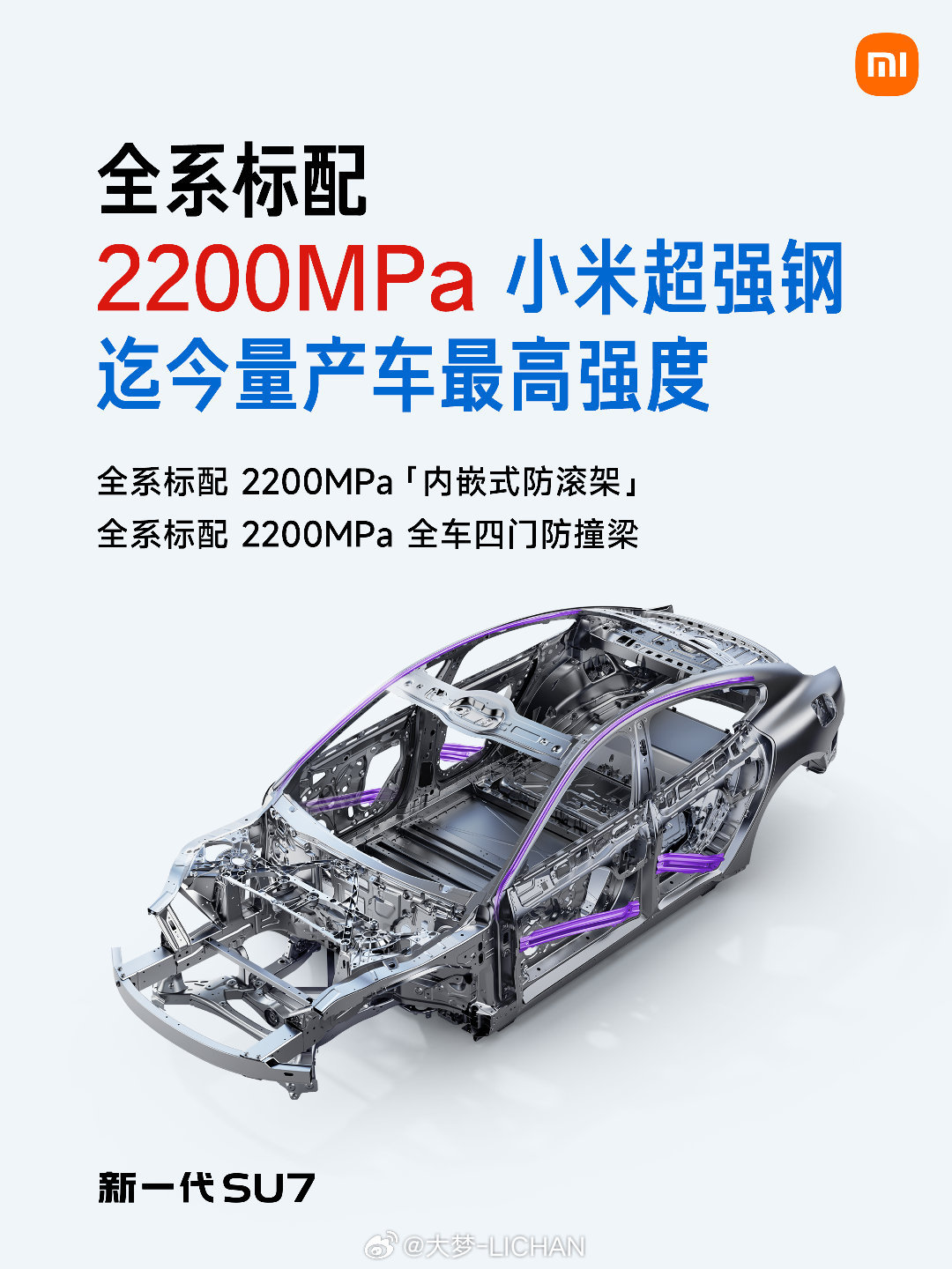 新一代SU7也是如此,小米在安全性上又下了狠功夫。大家可以看到这次的2200MPa超强钢是从A柱延伸到C柱,这是跟之前的YU7不一样的,所以它就能够更好的应对碰撞和钻卡这种场景。