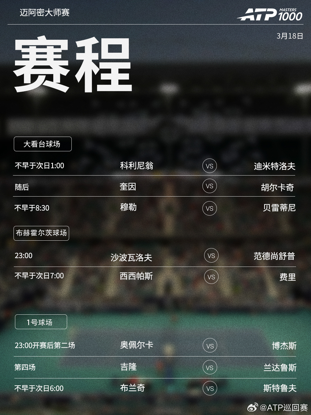 ATP1000 迈阿密大师赛今日展开上半区首轮争夺,赛程见图(均为北京时间)👀