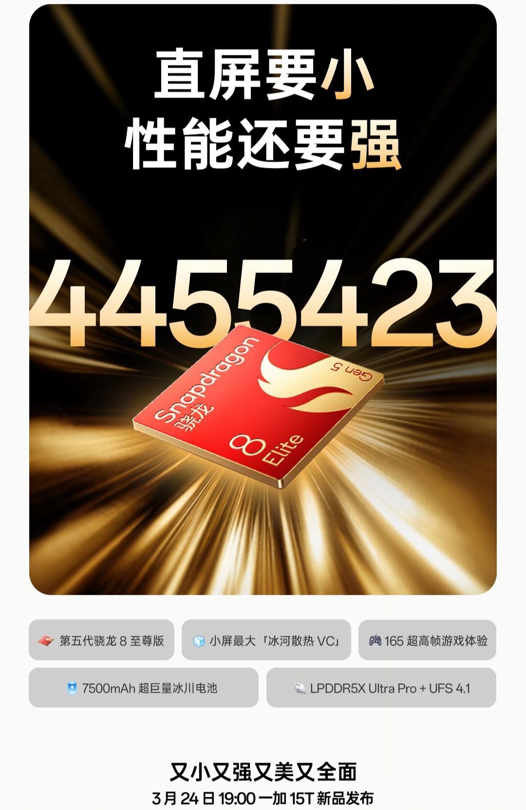 一加15T,6.32英寸,194g,第五代骁龙8跑分445W,还有7500mAh大电池,怎么想一个小尺寸也塞不下这么多神配置啊。这么强的小屏机?第一反应:我不相信会有这样的手机,一加不会在忽悠我吧。这么满的配置,下一代怎么卷,我都替他们着急。
