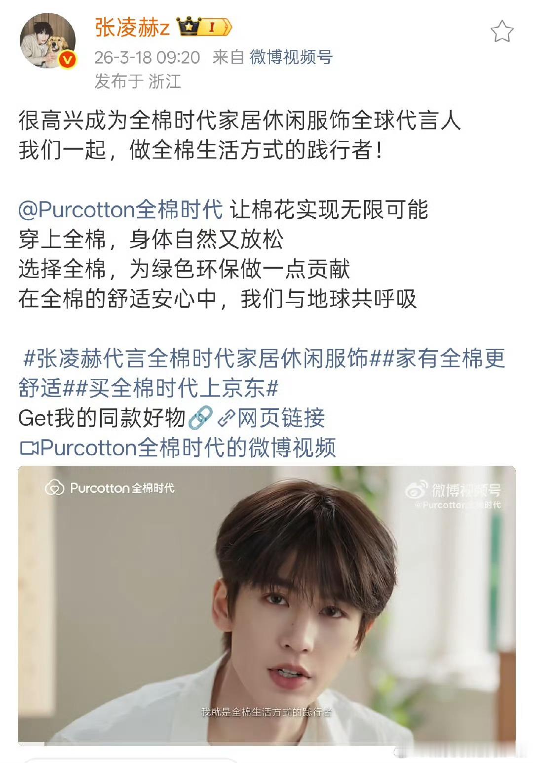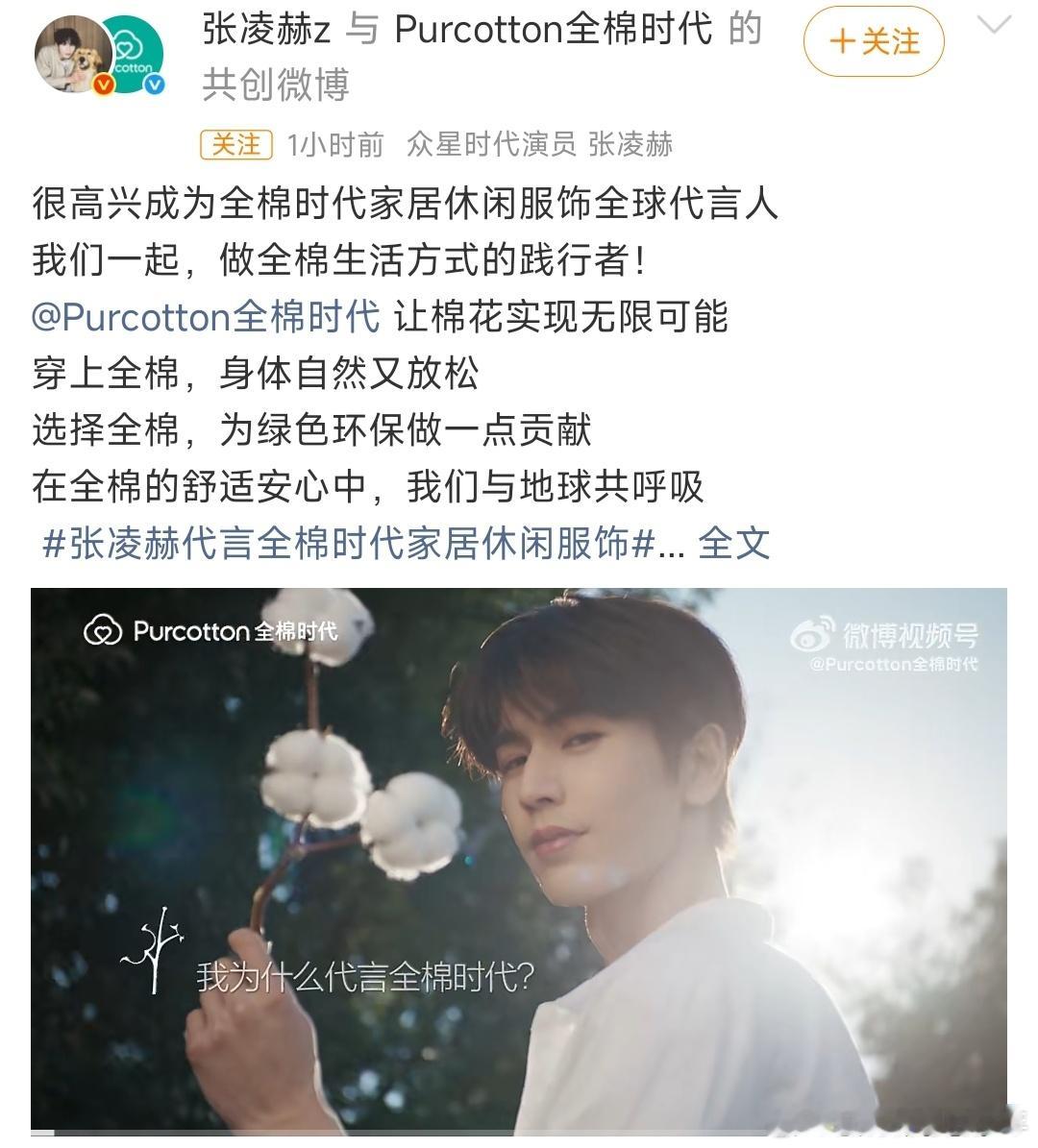 张凌赫代言全棉时代家居休闲服饰恭喜🎉🎉张凌赫官宣全棉时代家居休闲服饰全球代言人 代言人干干净净的帅气~凌帝商务➕1👏👏👏张凌赫代言全棉时代家居休闲服饰
