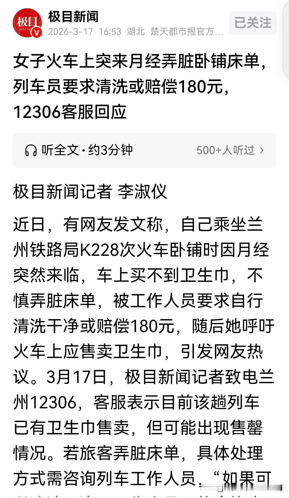 何苦为难女人?甘肃兰州,一女子坐火车卧铺,正睡着觉,突然来月经。她没带卫生巾,火车上也不卖这个。向其他乘客借,她又张不开嘴求助。女子于是把衣服垫在屁股下,可还是把床单弄脏了。列车员要求她赔偿180元,要么就把床单洗干净。女子赔不起,只能在卫生间洗床单。好不容易洗干净了,女子害怕又给弄脏了,一直站着。网友:卖盒饭的小推车没地方了吗? 长途出差,不仅身体容易劳累,最尴尬的就是遇到紧急情况。张女士所经历的这件事,估计足以能让他记一辈子。 事情的大致是这样的。张女士因为工作安排需要出差,单趟路程就需要十几个小时。为了让自己尽可能的舒服一些,保证良好的状态,张女士特意订了一个卧铺票。 随着夜幕降临,张女士躺在卧铺上玩了会儿手机便睡着了。迷迷糊糊当中张女士感觉到有些异样,这才发现自己竟然来了月事! 由于身体的原因,张女士的月事很没有规律,而这次出差又比较着急,他根本就没有提前做准备。 无奈之下,张女士只能小心翼翼的从卧铺上爬下来,准备去问一下列车员,火车上有没有卖女性用品的。 在张女士看来,每次坐火车的时候,列车员都会推着一辆小推车,上面有零食,有地方特产,有盒饭,品类多样,像卫生巾这种女性用品应该也会有准备。 可让张女士意外的是,火车上并没有卖这些东西。 这可把张女士给愁坏了,他又无奈的翻了翻包,希望包里能够有之前遗留的卫生巾,可翻来翻去还是一无所获。 张女士无助的看了眼列车上其他的乘客,由于此时已经来到了深夜,列车上的乘客除了零零星星几个男乘客正在刷手机之外,女乘客基本上都坐在那里睡着了。 张女士也打算向那些女乘客求助,可是他尝试了很多次,始终鼓不起勇气来。 眼见实在没有办法了,张女士只能脱下自己的外套,垫在自己的屁股下面,心里默默的祈祷,一定要坚持到天亮。 可能是由于太累了,到了下半夜,张女士眼皮一沉便昏昏睡了过去。 等到他醒来的时候已经到了天亮。 猛然惊醒的张女士第一时间是赶紧查看自己的情况,眼前的一幕让他尴尬又无助。 他垫在屁股下面的那件外套早就被经血洇透了,不仅如此,床单上也被他给弄脏了。 张女士无奈的拍了拍额头,就当他不知道该怎么处理时,列车员刚好来到车厢里进行检查,也无意间发现了被张女士弄脏的床单。 张女士本来就没打算隐瞒,小声的告诉列车员是什么原因。 列车员倒也没多说什么,不过事情已已经发生了,总得解决列车员给张女士两个选择。要么赔偿180元,要么把床单洗干净。 一条床单180元,明显超过了张女士的预算。可这件事毕竟是由自己的疏忽所致,张女士只能选择把床单洗干净。 就这样,张女士在众目睽睽之下,拿着被弄脏的床单走进了火车卫生间里,费了好大功夫才把床单洗干净。 可事情还没有结束,由于张女士并没有到目的地,他担心要是再把床单给弄脏了,还得重新清洗。索性张女士也不去卧铺了,一路上就这么站着,到达了目的地。 下车之后,张女士忍不住发文吐槽:火车上会配备热水供应,也有卖零食和卫生纸等商品的,为什么没有卫生巾之类的?这对于女性乘客来说也是必需品! 《民法典》第823条规定,旅客因自身原因造成承运人物品损坏,应承担赔偿责任。 但无故意/重大过失、属不可控情形(如突发生理期),可免责或仅承担合理清洗费。 在本案中,列车员虽然提出让张女士赔偿180元,不过也有第2种解决方案,把情床单清理干净。从这方面来看,列车员的做法并没有什么不妥之处。 不过张女士的吐槽也戳中了很多女性乘客的内心,也希望列车上能够尽早配备,为女性乘客提供一些便利。 对此你怎么认为?