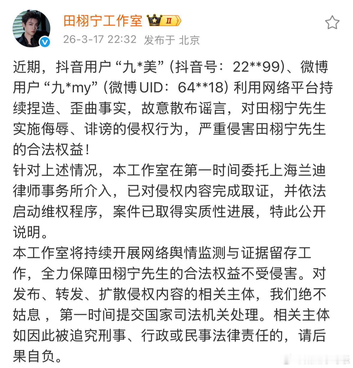 田栩宁工作室已申请立案谣言止于智者 不要盲目跟风!正义虽迟必到!!!田栩宁工作室已申请立案