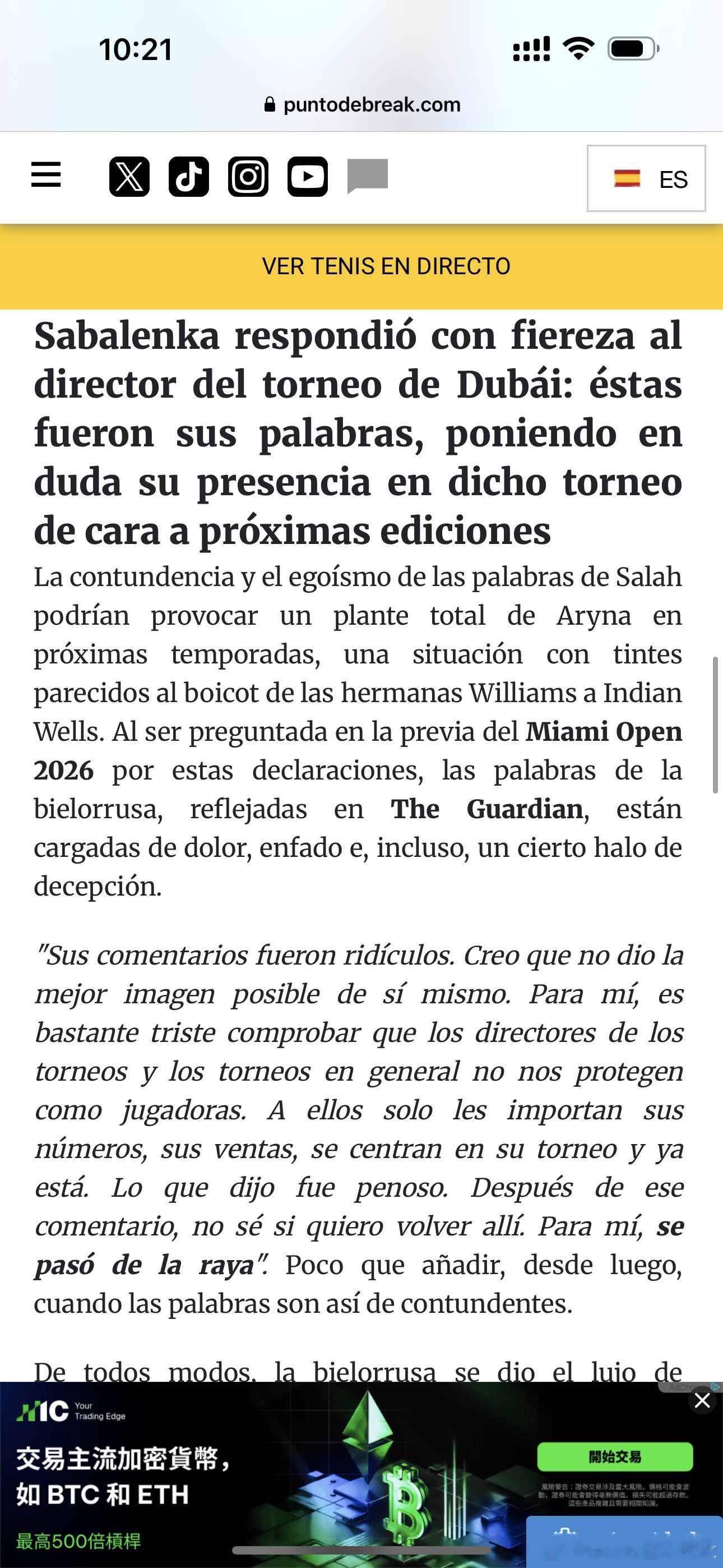萨巴伦卡在今天迈阿密接受卫报采访时谈到了此事:“他的评论非常荒谬。我认为他完全没有展现出自己体面的一面。对我来说,很遗憾地发现,赛事总监和整个赛事方并没有保护我们这些球员。他们只在乎自己的数据、门票收入,只关心自己的赛事,仅此而已。他说的话令人难堪。在这番言论之后,我不知道自己还想不想再回去那里参赛。对我而言,他越界了。”