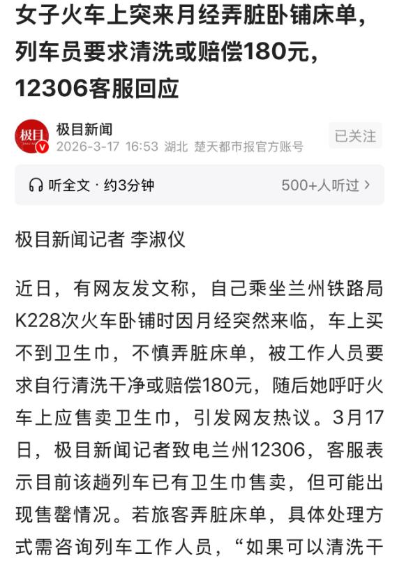 甘肃兰州,一女子坐火车,“大姨妈”突然到访,发现随身携带的卫生巾用完了,车上还没买到,无奈之下,把衣服垫在身下,结果,还是把卧铺上的床弄脏一大片,列车员告诉她:弄脏床单要么自己当场清洗干净,要么赔偿180元,女子没钱赔,只能尴尬的洗床单,事后,女子将此事曝光,认为,卫生巾是女性刚需,火车应提供,12306作出这样的回应,网友:既然知道是刚需,就应该自己准备,还能赖谁? 最近有个事在网上吵得挺热闹,主角是一位甘肃兰州的张女士,事情发生在去年10月份,她过了大半年才发出来,说是最近才想起这事,越想越觉得委屈。 那天张女士坐的是兰州铁路局的K228次火车,全程十多个小时,得在卧铺上过夜,她自己经期本来就不规律,上车没多久,大姨妈就突然到访,可翻遍了包才发现,随身携带的卫生巾已经用完了。 她当时就慌了,赶紧找列车上的工作人员问,能不能买到卫生巾,结果被告知没有,那时候都半夜了,周围的乘客都睡着了,她也不好意思开口去借,没办法,只能把自己的衣服垫在身下,小心翼翼地熬了一整夜,就怕把床单弄脏。 可偏偏事与愿违,第二天中午,她还是发现卧铺上的床单被弄脏了一大片,张女士也没藏着掖着,主动找到了列车员说明情况,想着好好沟通一下,看看能不能有个妥善的解决办法。 没想到列车员直接给了她两个选择,要么当场把床单清洗干净,要么赔偿180块钱,张女士当时身上没那么多钱,只能硬着头皮选择洗床单,那种场景想想都尴尬。 人来人往的火车上,她蹲在角落搓床单,脸都红到了脖子根,洗完之后还怕再弄脏,就一直站着,直到下车。 事后张女士把这事曝光了,她不是不承认自己有责任,也知道弄脏了公共物品该赔偿,但她就是想不通,火车上能卖热水、零食、卫生纸,卫生巾明明是女乘客的刚需,为什么就不能提供? 后来有人咨询了12306,得到的回应是,现在那趟K228次列车已经有卫生巾售卖了,但因为火车是流动的,没办法保证每趟车都备货充足,有时候需求量大了就会售罄。 至于弄脏床单的处理方式,客服说具体要看列车工作人员的安排,能洗干净就换床单,洗不掉的话,就得看车上的相关规定。 这事一出来,网友们瞬间吵翻了,有一部分网友觉得,既然知道卫生巾是刚需,出门的时候就该自己多准备点,这是自己的疏忽,不能赖火车上没卖,弄脏了床单赔偿也是应该的。 但也有很多网友共情张女士,说经期不规律这事谁也控制不了,突发情况真的没办法,而且180块钱的赔偿也不算少,普通的床单也不值这个价,列车员的处理方式太生硬了,一点人情味都没有。 其实说白了,这事没有绝对的对错,张女士确实有疏忽,出门没备足刚需用品,可火车作为公共交通工具,也该多考虑一下女乘客的特殊情况,现在很多商场餐厅都能提供应急卫生巾,火车上做到这一点其实也不难。 希望铁路部门能完善一下服务,多备点应急卫生巾,同时也明确一下弄脏床单的处理标准,别再让乘客陷入这种尴尬又无助的境地,也提醒各位女同胞,出门尤其是坐长途火车,刚需用品能多带就多带,免得遇到突发情况,遭罪的还是自己。