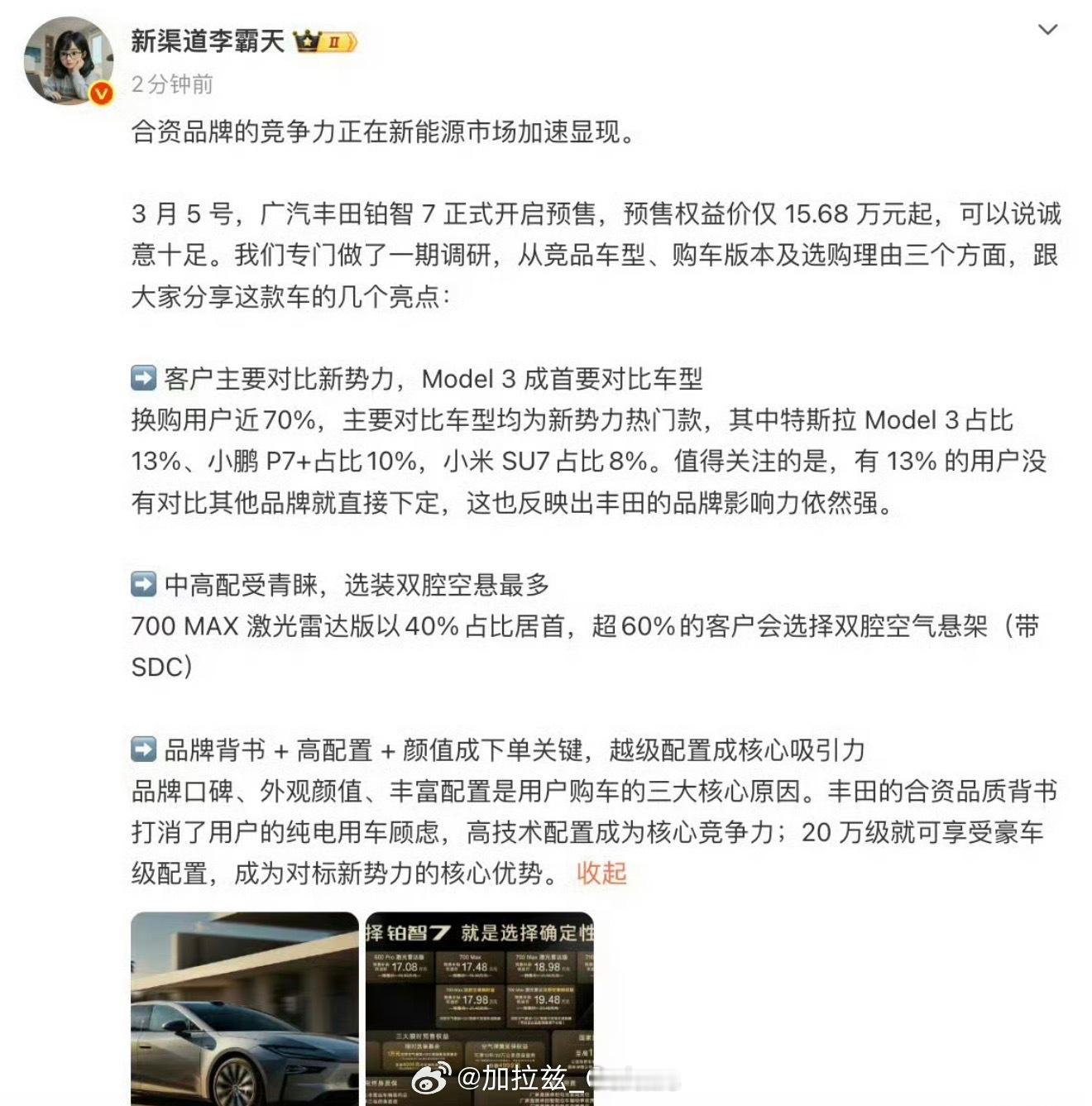 买特斯拉和丰田电车竟是同一批人看到铂智7的预售用户画像,有几个数据挺有意思: