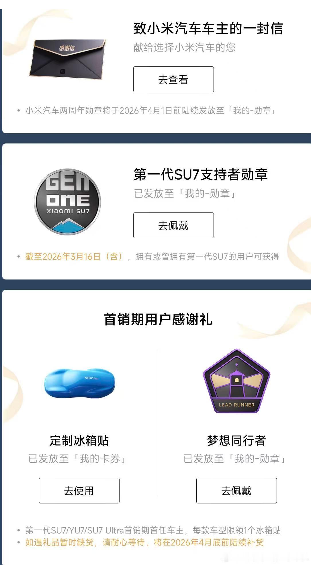 小米汽车2周年,给首销车主们送了冰箱贴,样式有点类似车钥匙,不少群里的车友都已经领取了,各位车主记得去领一下~小米汽车小米汽车