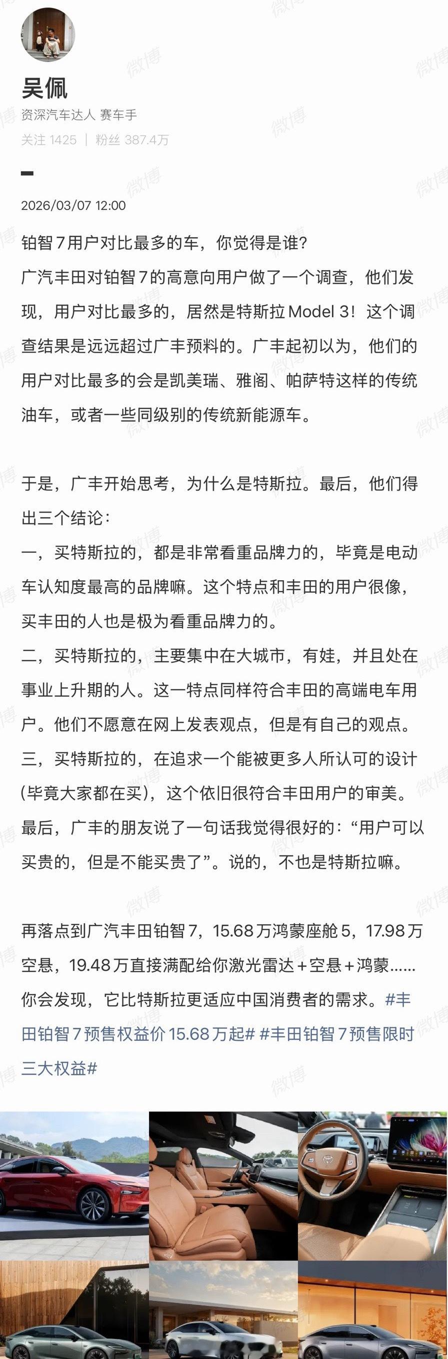有个比较有趣的调查数据:买特斯拉和丰田电车竟是同一批人 ,用户对比最多的车型是特斯拉Model 3,占比高达13%,远超小鹏P7+、小米SU7,这在合资电车中令人有些意外。分析一下个中缘由,特斯拉与丰田都是全球大厂,都能给用户可靠安心的购车确定性。这一现象也印证了中国新能源市场愈发成熟,用户不再盲目跟风,更看重品牌、品质与实用价值,而铂智7,正是凭借均衡实力,成功跻身主流电车第一梯队。 从用户画像能清晰看出,铂智7的受众都是懂车、挑剔的老车主,换购比例高达70%,首购仅10%,增购20%,足见其硬实力征服了资深用户。购车偏好上,近60%用户选择中高配,超50%锁定空悬版本,空气悬挂+SDC选装占比接近70%,仅需5000元就能拿下,性价比拉满。用户购车核心原因也很明确:丰田品牌口碑背书、出众外观颜值、越级丰富配置,每一点都精准戳中需求。 被用户主动与行业标杆Model 3对标,不仅是铂智7热销的信号,更是产品力与品牌力的双重认可。铂智7入门即豪华,全系标配鸿蒙座舱、华为DriveONE电驱,17万级就搭载双腔空悬,19万可配齐激光雷达智驾、双腔空悬、鸿蒙座舱,配置密度同级领先,还有丰田严苛品质与六重安全冗余兜底。丰田铂智7用户首选对比Model3