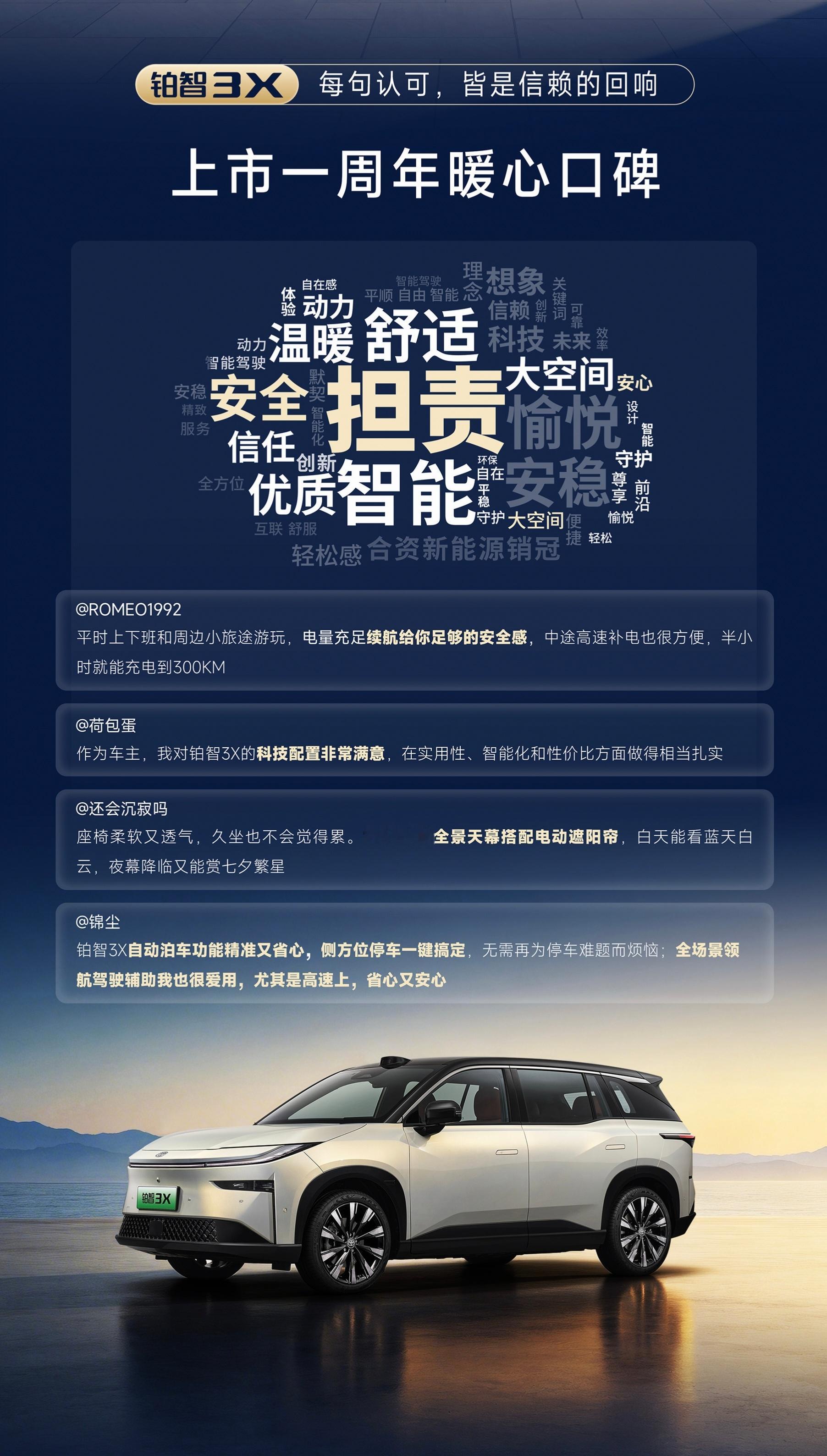 丰田铂智3X上市一周年重磅OTA铂智3X这次OTA的智驾智舱双进化,想必车友们都感受到了这车是越开越好开……那也确实是,这车更值了,这次周年重磅OTA也很走心丰田铂智3X升级R6大模型新的亮点都踩在实用点上。亮点一就是智驾,升级了R6强化学习大模型,应对加塞、鬼探头都很稳,低速拥堵会选最优车道,无保护左转避障也流畅,新增的智驾行程报告能看清数据,INP脱手还能安全靠边,日常开着超省心,市区高速都觉得踏实。这套智驾智舱用了,就会越用越顺手,六大AI智能体特别懂需求,一句话就能规划路线、点咖啡、做绘画,实用性拉满。微信小程序丰富了车内娱乐,内存管理器让车机更丝滑,大床模式加了主驾单人床,午休舒服,细节全是用心。还有厂家三担责政策兜底,开车没顾虑,能感受到品牌真的为用户考虑,期待铂智后续新动作~丰田铂智3X升级R6大模型