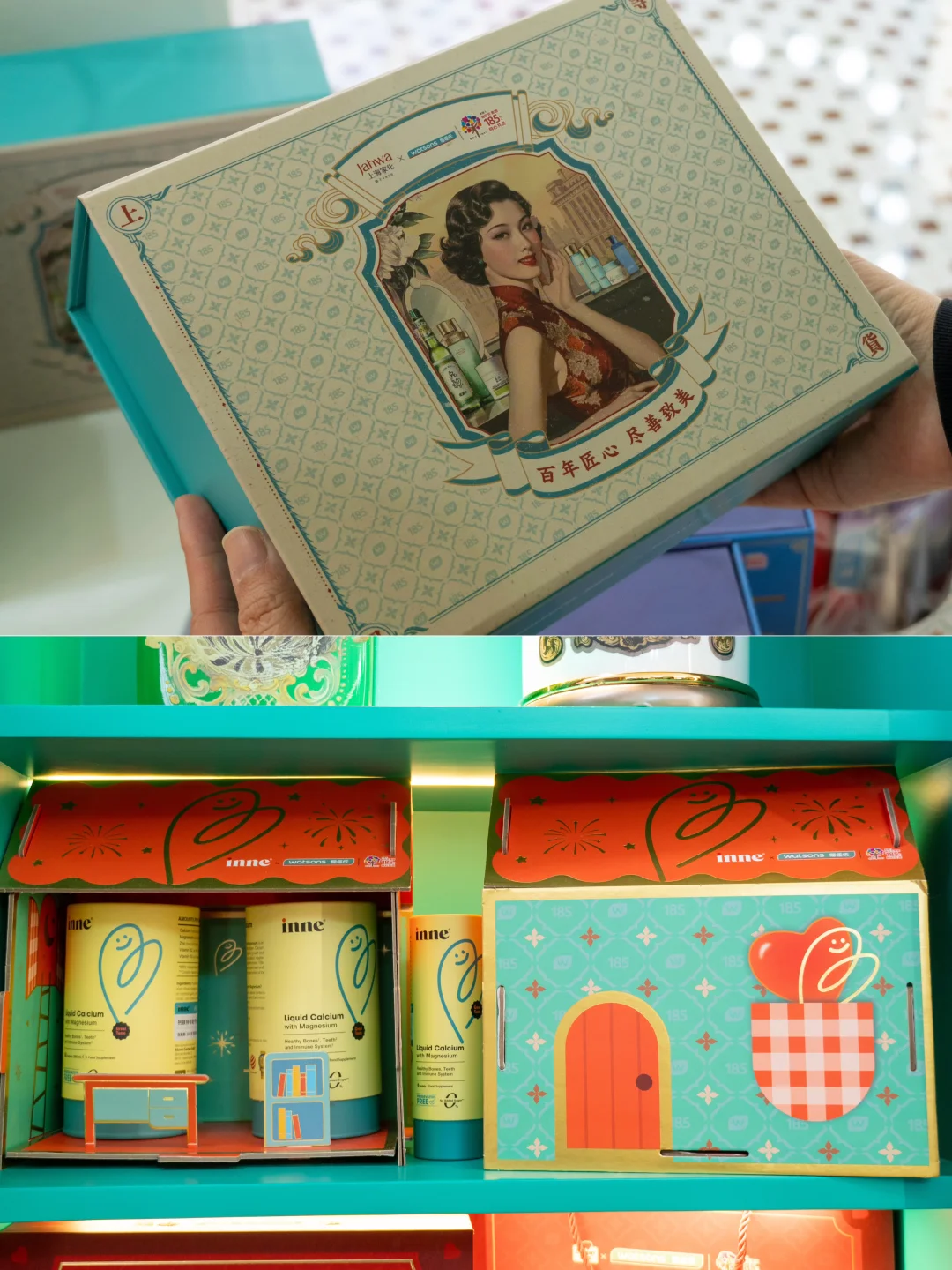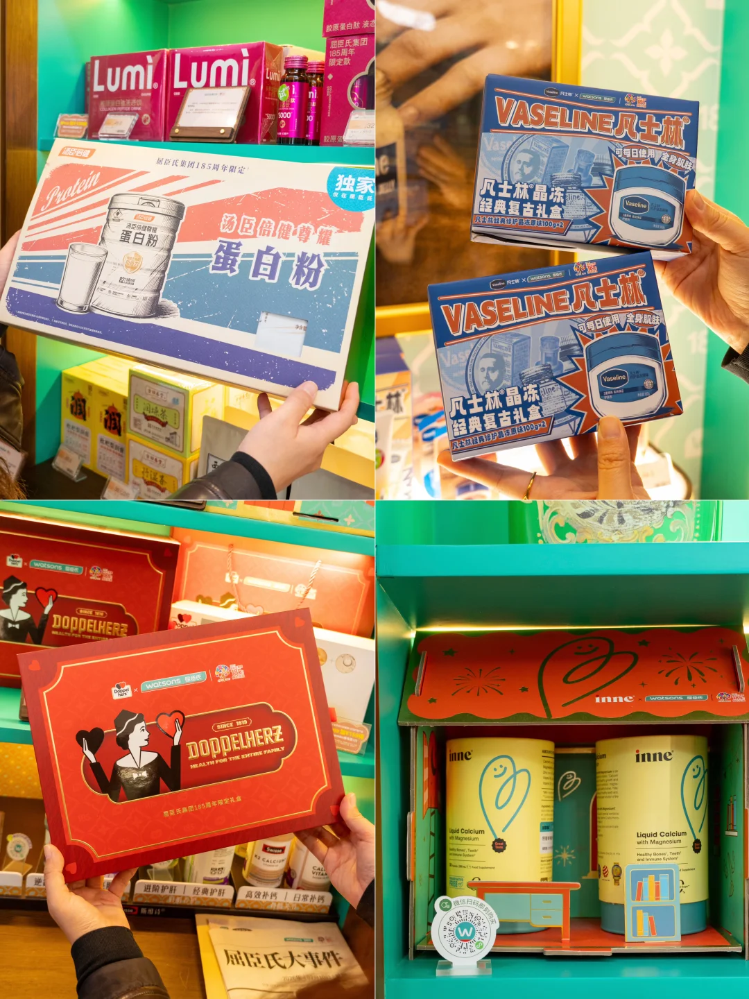 逛买逛买也超尽兴,像上海家化复古臻藏礼盒、汤臣倍健尊耀蛋白粉礼盒、双心复古礼盒、Inne小金条钙镁锌定制礼盒、凡士林经典修复晶冻全都是185周年限定的复古包装📦每一样都想带回家~现场🈵消费满185还有显眼包和雨伞可以选择带走!