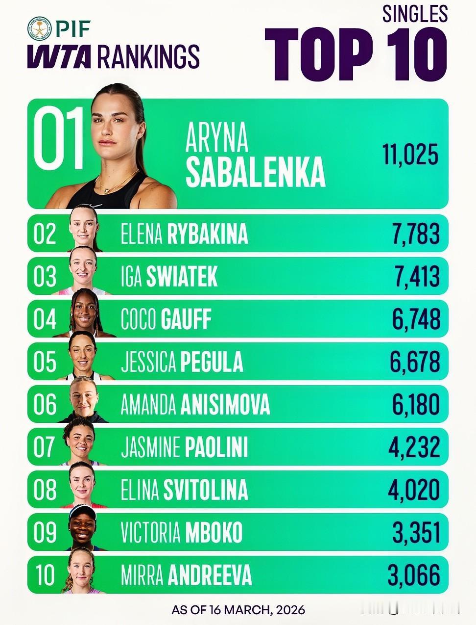 最新世界排名,中国🇨🇳一姐易主王欣瑜,萨巴伦卡以11025积分高居榜首,莱巴