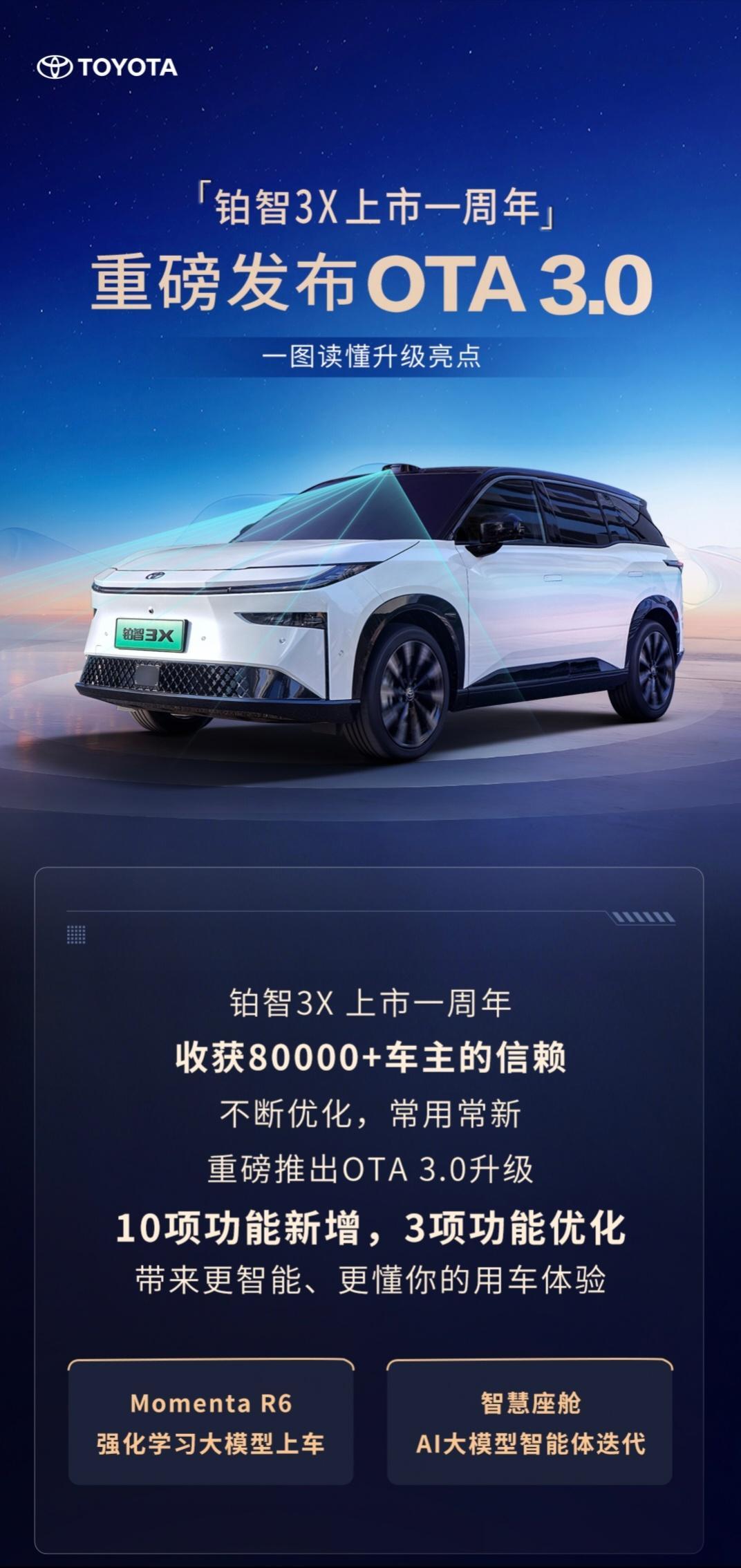 3月18日 ,广汽丰田铂智3X官宣重磅OTA升级 ,重点聚焦用户最关心的智驾、智舱、 安全三个方面。本次升级里 ,最有含金量的一点 ,是Momenta R6强化学习大模型免费上车 ,而且覆盖全量车主。