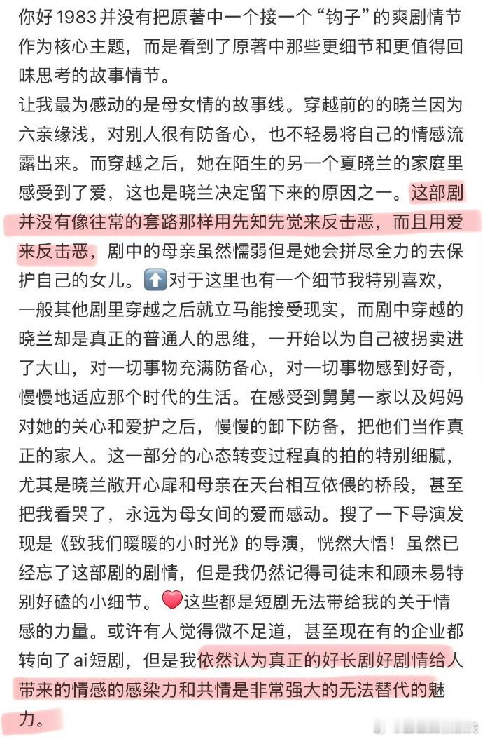 作者书粉剧粉三重肯定的你好1983你好1983作者书粉剧粉三重肯定重生八零 媳妇有点辣 越来越多人关注《你好 1983》,这部剧确实没让人失望。原著本身就很好看,制作团队用心创作,演员演绎贴合角色,它跳出了普通爽剧的套路,以亲情为底色,背景真实,后续剧情充满期待。