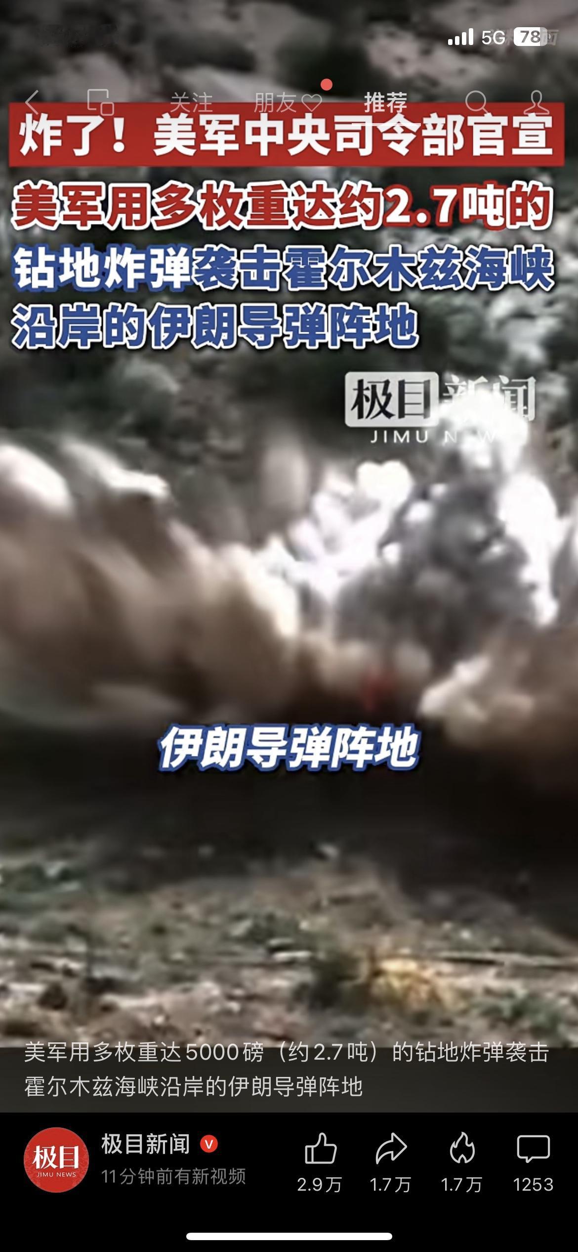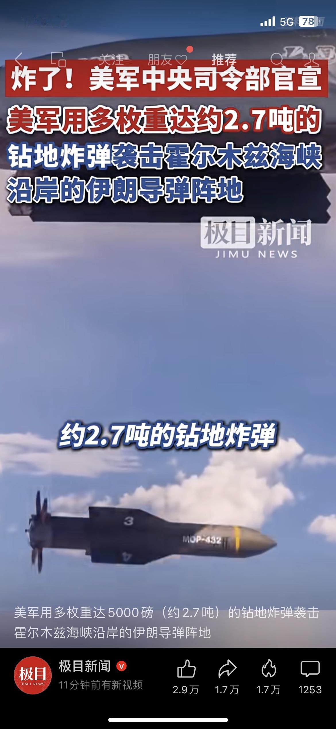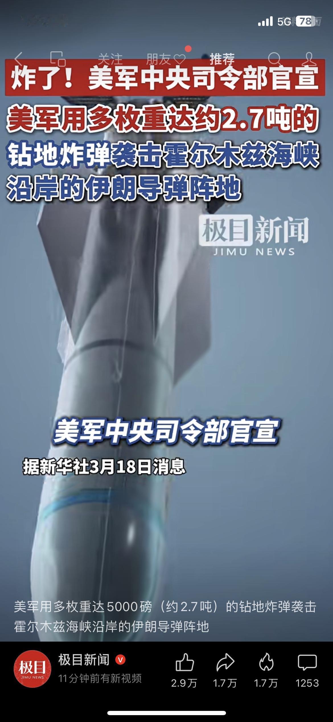突发!美军官宣:2.7吨钻地弹砸向伊朗导弹阵地,霍尔木兹海峡拉响警报🔥 刚刚,美军中央司令部正式官宣:多枚重达5000磅(约2.7吨)的钻地炸弹,精准打击了霍尔木兹海峡沿岸的伊朗反舰巡航导弹阵地。 这种被称为“掩体粉碎机”的重型弹药,能击穿数米厚的加固混凝土,直捣地下核心设施,美军声称此次行动是为了消除“对国际航运的严重威胁”。 截至目前,伊朗方面尚未公开回应,而美军正往中东增派5000名海军陆战队,两艘航母战斗群也已在附近海域就位。 要知道,霍尔木兹海峡承担着全球近1/3的石油运输量,这一拳下去,国际油价会不会应声跳涨?中东局势会不会彻底滑向失控边缘? 大家觉得伊朗会选择隐忍,还是会用导弹反击?评论区聊聊你的判断👇 美军袭击伊朗 霍尔木兹海峡 国际局势 钻地弹