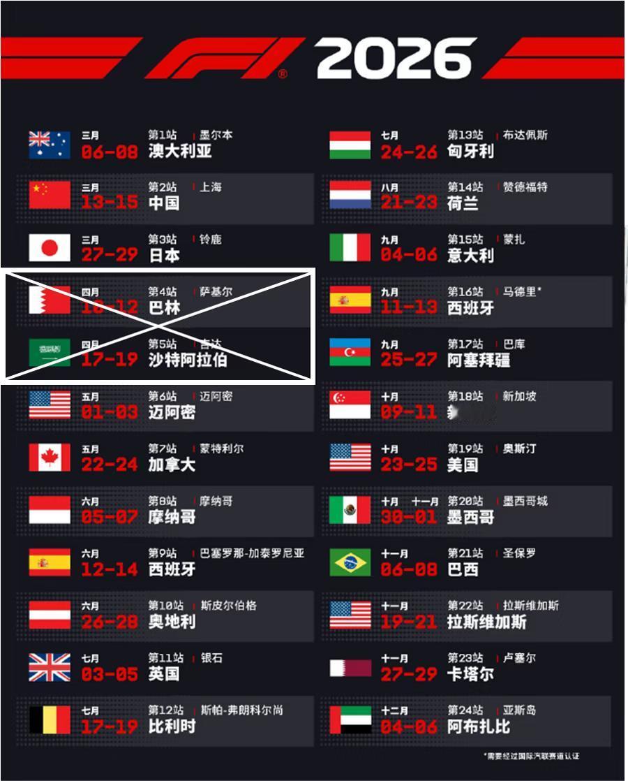 2026年的赛事安排已经出炉了有一段时间了,我想说的是巴林和沙特的这两场赛事还能开展吗?这两个国家的情况相比不用我多说,大家应该也了解,有没有替补方案啊?【来自懂车帝车友圈】