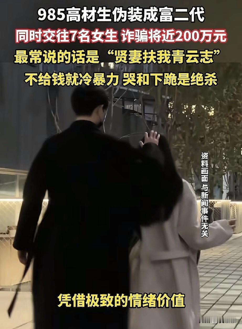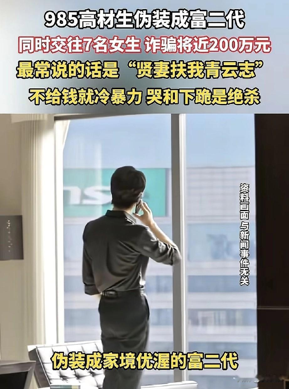上海,男子伪装成富二代身份,称自己名校毕业,同时交往7个女友,从这些女友身上诈骗了将近200多万,网友都说这些被骗女孩不冤,可女孩说:“我们也是想找个好的归宿啊!” 该男子一直装成有钱的富二代,开的豪车是租来的,口头禅是“贤妻扶我青云志”,专门哄女孩子开心,他跟每个女孩都说要一起奋斗、共创未来,然后找各种理由借钱,有个女孩为了帮他,从月租一万五的房子搬到了两千五的隔断间,前前后后给了他122万。 事情败露源于其中一个女孩半夜发伤感动态,被另一个女孩刷到了,两人一对时间线,才发现男朋友是同一个人,更离谱的是,这男的还养了条狗,轮流带去不同女朋友家,对谁都说是两人的“爱情见证”。 女孩们发现被骗后报警,男子被抓,网友评价:能同时哄住7个女生,这本事干点啥不好,非得走歪路,那句“贤妻扶我青云志”,翻译过来其实就是“快打钱”,女孩们一定要看清身边人啊!