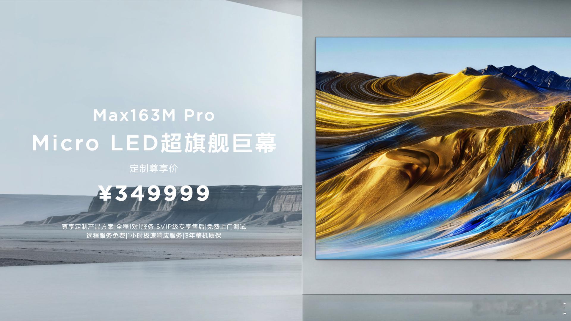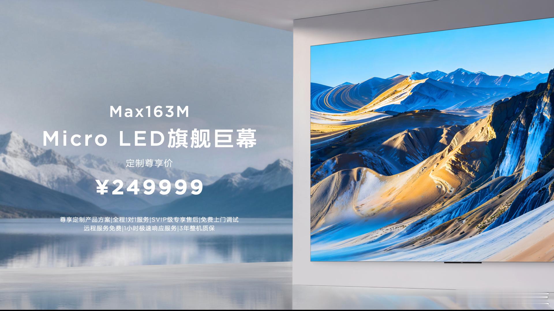 Max163M Pro搭载2488万+无机自发光芯片,真4K+像素级控光,XDR 10000+nits亮度,极景无黑边设计,堪称豪宅顶配,售价349999元。Max163M则以249999元的价格,让更多家庭拥有一台真正的163吋Micro LED电视,真4K实像素、10000nits亮度,核心体验毫不妥协。