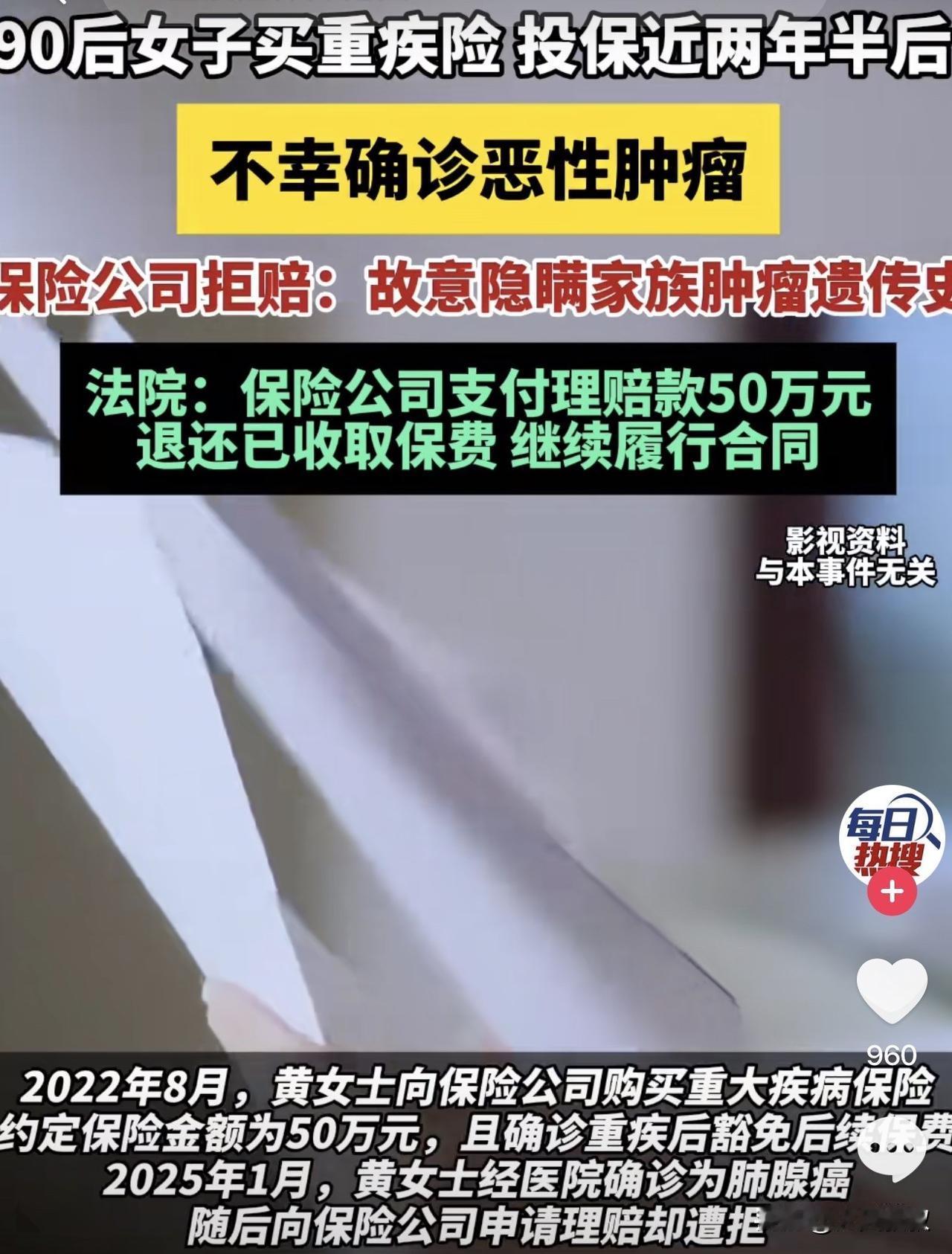 北京,一女子购买了一份重疾险,结果两年多之后女子不幸身患癌症,女子打算动用这份保险理赔,结果保险公司却直接予以了回绝,原因是女子隐瞒家属有类似疾病的病史,所以无法获得理赔,女子不满直接将保险公司告上了法院,要求对方支付50万的保险金。 据悉,黄女士在2022年8月份,购买了一份重疾险,保额是50万元,25年1月的时候,黄女士因身体不适去医院检查,结果被确诊为了癌症,随后,黄女士就打算向保险公司理赔。 但是,保险公司却认为,黄女士在投保的时候,故意隐瞒了家族患有类似疾病的历史,所以,黄女士在投保的时候没有如实告知,所以,保险公司就拒绝了黄女士的索赔要求。 于是,黄女士一纸诉状将保险公司告上了法院,要求保险公司支付赔偿金50万元。 事发后,有网友表示,人家交钱的时候你不问清楚了,现在人家生病了要理赔了,你这各种问题揪出来了。 还有网友表示,人家家人有疾病,这算是个人隐私,为什么要说,只要自己没有患上疾病,那么就是健康的,保险公司应该理赔,又不是在投保的时候人家就患病了。 实际上,购买过保险的朋友都清楚,除了业务员在告知投保人一些必要提示之外,还需要在保险合同中写明以上内容都看过,以及我已阅读之类的。 但现实是,对于保险合同的专业术语,一般人是很难读懂的,或者是根本不会去读的,但是,这些专业的内容,涉及到免除保险公司责任的条款,而这些条款,保险公司不仅要加深字体,甚至要做出额外说明,即要尽到告知、提示的义务。 根据《保险法》第十七条规定,对保险合同中免除保险人责任的条款,保险人在订立合同时应当在投保单、保险单或者其他保险凭证上作出足以引起投保人注意的提示,并对该条款的内容以书面或者口头形式向投保人作出明确说明;未作提示或者明确说明的,该条款不产生效力。 所以,如果保险公司没有尽到这个告知义务,导致投保人没仔细看或者根本没有看,以及业务员也没有做出解释的情况下,是不对投保人生效的。 本案中,黄女士家属患有类似疾病,但是黄女士本人是健康的,在这种情况下,黄女士是否具有告知义务? 保险法第十六条规定,订立保险合同,保险人就保险标的或者被保险人的有关情况提出询问的,投保人应当如实告知。投保人故意或者因重大过失未履行前款规定的如实告知义务,足以影响保险人决定是否同意承保或者提高保险费率的,保险人有权解除合同。 显然,对于保险公司提出的询问,投保人是要如实告知的,如果未告知,而这有影响到了保险公司是否愿意承保或者提高保费的,那么就会涉及解除合同的问题。 而法院审理后则认为,黄女士如实告知的事项,仅限于保险公司询问的事项,而且保险合同中也没有涉及到家族病史方面的表述,所以,法院认为保险公司拒赔的理由不充分,因此判决保险公司支付黄女士赔偿50万,退还保费,保险合同继续有效。 其实,这个案例给保险公司敲响了警钟,不能以为投保人未如实告知,就可以拒赔了。 对此,你对本案有什么看法? —————————— 关注我,带你评析法律热点,关注冷暖人生。 文章原创,抄袭必究