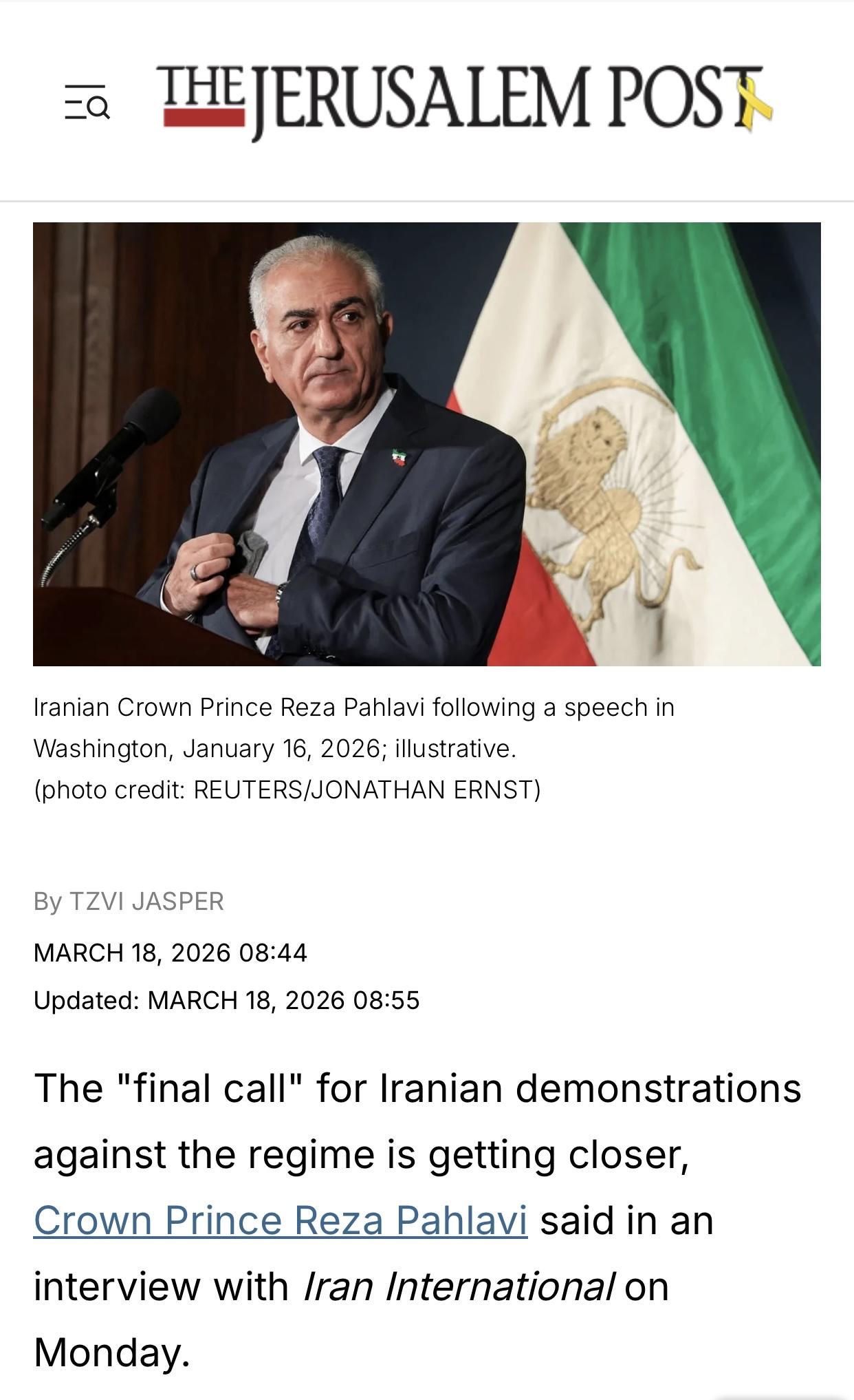 以媒:巴列维呼吁伊朗人等待”最后的召唤”并首次透露,伊朗国内存在名为”不朽卫队”抵抗组织及《繁荣项目》的重建计划 以色列《耶路撒冷邮报》官网3月18日报道:伊朗王储礼萨·巴列维周一在接受伊朗国际电视台采访时表示,伊朗反政府示威活动的“最后召唤”即将到来。 报道说,巴列维警告说,伊朗政府“毫不犹豫地镇压人民”,并准备杀害数十万人以保护权力。因此,他说,“运动必须明智地进行。最后的呼唤将在正确的时间发出”("the movement must proceed intelligently. The final call will be issued at the right moment.”)”,“我认为,在与这个犯罪政府打交道47年后,我们所有人都在数着日子,直到这个制度最终消失。我们希望在它崩溃后的第二天,伊朗人民可以实现他们真正应得的东西:完全的自由以及重建和繁荣的机会”。 报道称,巴列维说,以色列和美国的军事压力削弱了伊朗伊斯兰革命卫队(IRGC)和”巴斯基”准军事部队(Basij),再加上国内行动主义,政权崩溃正在发展。“国内的不朽卫士成员通过组织和协调工作,有能力从内部发起进一步打击”,他解释道,他指的是在伊朗境内运作的一个秘密网络,旨在破坏现政权。“我们在国内看到的许多事态发展并非自发产生,而是有组织工作的结果”。 “‘不朽卫士’是由人民自己孕育而生的”,巴列维说道,“在这一阶段,它扮演着防御角色,帮助保护人民的生命安全,打击当局用来散播恐惧和暴力的机构”(“The Immortal Guard is born from the people themselves,” Pahlavi said. “At this stage, it plays a defensive role, helping protect people’s lives and striking institutions that the authorities use to spread fear and violence.”)。 报道说,巴列维认为,人民的反对是建立在伊朗文化认同的基础上的,而这种认同一直受到政权的压制。“从一开始,伊斯兰共和国(指现政权—译者注)就与诺鲁孜节(Nowruz,是伊朗具有3000多年历史的传统节日,相当于我国的春节—译者注)和恰赫尚贝苏里(Chaharshanbe Suri,即跳火节,伊朗的传统节日—译者注)等文化传统相抗衡,因为他们优先考虑的并非是伊朗本身”,他说道。 报道说,在采访中,巴列维介绍了一项在政权倒台后重建伊朗的持续计划,计划称为“繁荣项目”(the "Prosperity Project”)。”繁荣项目的目的是要确保除政治活动家之外,专业人士和专家也能为未来做规划”,他解释道。 巴列维描述说,该项目涉及让来自各个领域的专家——如法律专家、经济学家、医疗保健专业人员和教育工作者——为国家治理准备提案(The project, Pahlavi described, involves having experts from various fields - such as legal experts, economists, health care professionals, and educators - prepare proposals for the governance of the country)。他说:“例如,法律专家可以解释在过渡期间应该如何实施司法,以及应该如何处理当前制度内的官员。而经济学家可以概述如何重建经济和吸引投资”。 巴列维补充说,在决定国家未来之前,可能需要临时维持运营,现有的国家基础设施和工作人员都要保留,但长期治理将由制宪议会和全国公投决定,而过渡时期期间,甚至需要现有军事机构的成员参与工作。他说:“我来自一个军人家庭,我自己是一名飞行员。我理解那些保卫国家的人的价值。无论是军队、警察还是宪兵,我们都需要这些人来维护国家安全”,又说:“只要这些人的双手没有沾染人民的鲜血,他们就没有理由不能为国家的未来服务”。 报道说,巴列维最后说,他到伊朗,可能会鼓励政权内部有人叛变,他已准备好接受“所有必要且经过深思熟虑的风险”以重返伊朗。他说:”我毫不怀疑,这个制度最终会消失,人民会赢。重要的是,我们要继续响应召唤,继续我们的运动并致力于重建国家”。 报道的原标题是《Iran's regime collapse approaching, but 'final call' must come at right moment, Pahlavi says》(伊朗政权即将崩溃,但“最后的召唤”必须在恰当的时机发出,巴列维如是说)。