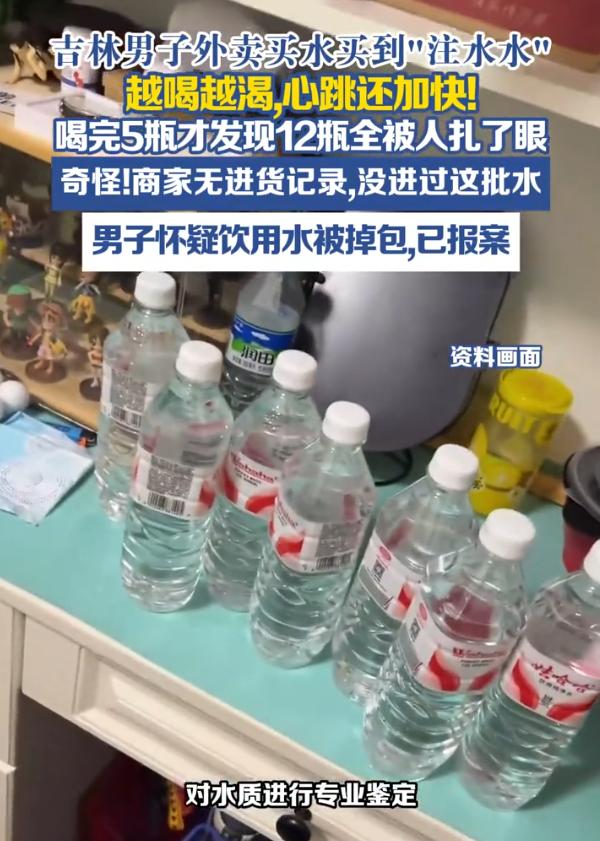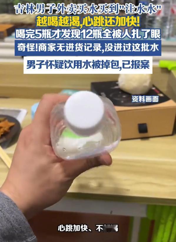 细思极恐!吉林四平,男子外卖了一箱矿泉水,不料,喝完后觉得越喝越渴,而且心跳加速,后来拿矿泉水一看,竟然12瓶矿泉水上面都有“针眼”,他不确定水有没有问题,但他怀疑,这些水可能被人掉包了 白先生介绍,自己这些矿泉水是通过外卖平台购买的,本来就是为了图个方便,渴了随时能喝,可喝完后就觉得不对劲 开始他还以为是自己身体的问题,压根没往矿泉水上面去想,可喝了5瓶后,他总觉得不对劲,拿起瓶子仔细看,结果发现了问题。每个瓶身上都有一个比针眼还细的小孔,不盯着看根本发现不了。他一挤瓶子,水从小孔里滋了出来。整箱12瓶,无一幸 他赶紧向监管部门举报。工作人员一查进货记录,发现商家压根就没进过这个批次的货。换句话说,这箱水根本不是商家原来卖的那箱,在半路上被人调了包 现在警方介入了,白先生也报了警。他最担心的不是水被换了,而是那5瓶水里到底被人加了什么东西。他希望能有鉴定机构帮忙检测一下水质,把这事儿弄个明白 对此,不少网友纷纷猜测水的来源和水质问题,而我看了这个事也有两点想法 第一,很多人点外卖只盯着商家靠不靠谱,觉得大牌子就放心。但这件事说明,从商家出库到送到你手上,这中间的配送环节同样可能有漏洞。一瓶水从出厂到消费者手里,经过仓库、配送员、外卖员,每个环节都可能成为风险点 第二,警方溯源其实不难,查监控、查配送记录、查进出库,总能找到是谁经手了这箱水。但最难的是搞清楚,为什么要这么做?如果只是想恶作剧,扎一瓶就够了,没必要12瓶全扎,这确实有必要查一下 这件事也提醒大家,收到密封包装的食品饮料,尤其是整箱的,打开之前最好多看一眼。有些东西肉眼确实难发现,但多留个心眼总没坏处