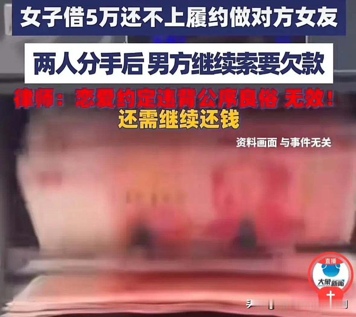 北京,一女子向男子借了5万元,起初男子还不愿意,可女子承诺,到期还不上,就做男子的女朋友,俩人还签了合约。谁曾想,两个人才交往一段时间,就因感情不和闹了分手。男子想要回欠款,可女子坚称,已经履行了合约内容,再给钱就亏大了。男子于是把女子告上法院,法院这么判! 李女士和吴先生是朋友关系,而且都是单身状态。两个人偶尔会在一起吃饭,彼此之间的印象还算不错。 老话说,多一个朋友就多一条路。当遇到困难的时候,朋友可能会拉你一把。 李女士就遇到了资金问题,由于自己一时没规划好,手头上的资金周转不开了。考虑到去银行贷款的话,不仅需要利息而且还很多的流程,相对来说比较麻烦,还不如去找朋友帮忙。 李女士第1个想到的人就是吴先生,希望吴先生能给他拿5万块钱周转一下,等有了钱会第一时间就还给他。 因为钱,朋友闹得反目成仇的案例可不在少数。这种事情吴先生也看了很多,当李女士提起这个要求的时候,说实话吴先生有些犹豫。 可又碍于朋友的情面,再加上吴先生一时间没想好拒绝的理由,犹犹豫豫的态度让李女士误以为吴先生心里有什么顾虑。 李女士本来就是心直口快的人,为了彻底打消吴先生心里的顾虑,他接着说出了一个让吴先生无比心动的条件。 如果李女士到期没有能力偿还这5万元的债务,那么李女士就给吴先生做女朋友。 在李女士看来,反正两个人都是单身,而且李女士身材高挑、模样也还算出色,做吴先生的女朋友,绝对能够拿得出手! 吴先生本来就对李女士有一定的好感,见对方都这么洒脱了,自己要是还扭扭捏捏的,倒显得自己没有格局了,于是便痛痛快快的答应了。 为了证明自己的诚意,李女士甚至还起草了一份合约,双方在合约上签字,按了手印。 自从把钱借给了李女士,吴先生的内心是既期待又煎熬。他不希望自己的钱打了水漂,却又希望李女士能成为他的女朋友。 不过回头想想,5万块钱换回一个女朋友,吴先生倒也不亏。 正如吴先生期盼的那样,等到了还钱的日子,李女士确实还没有筹够钱。按照合约的内容,李女士和吴先生正式确立了恋爱关系,两个人很快便同居了。 两个人刚开始交往的时候,满眼都是对方的模样,恨不得一天24个小时都让对方陪着。可随着时间一长,这份感情也慢慢变了味。 由于两个人生活习惯和消费理念都存在很大的不同,两个人开始出现争吵,接着便是冷战。 人总不能在一棵树上吊死,既然感情已经走到了尽头,没有什么好挽留的了,两个人最终决定分手。 不过让李女士没想到的是,分手没几天,吴先生便再次找到了他,想让他归还那5万元的欠款。 李女士听完当场就生气了。按照合约的内容,李女士答应做他的女朋友,就不用还那5万块钱了,这个人怎么这样,说话不算数呢! 吴先生根本就不听李女士那一套,见李女士坚决不还钱,便一纸诉状把李女士告上了法庭。 有人调侃,吴先生这人太精了,李女士做了他那么长时间的女朋友,两个人还同居了,到头来分手,又把5万块钱要回去,这可比那些谈恋爱的成本低多了! 能想出来以身抵债的人,也是个狠人! 《民法典》第153条第2款规定,违背公序良俗的民事法律行为无效。 在庭审时,李女士拿出了当时两个人签订的合约,在她看来,他已经履行了合约的内容,是无需偿还债务的。 可法院的判决却让他很是意外,由于两个人的合约内容违背了公序良俗,自然不受法律的保护,合同也是无效的。 既然李女士欠了钱,那么就应该足额归还。 面对判决,李女士简直欲哭无泪,但凡他要是懂一点法律,也不可能签一份让人啼笑皆非的合约。 对此你怎么认为?