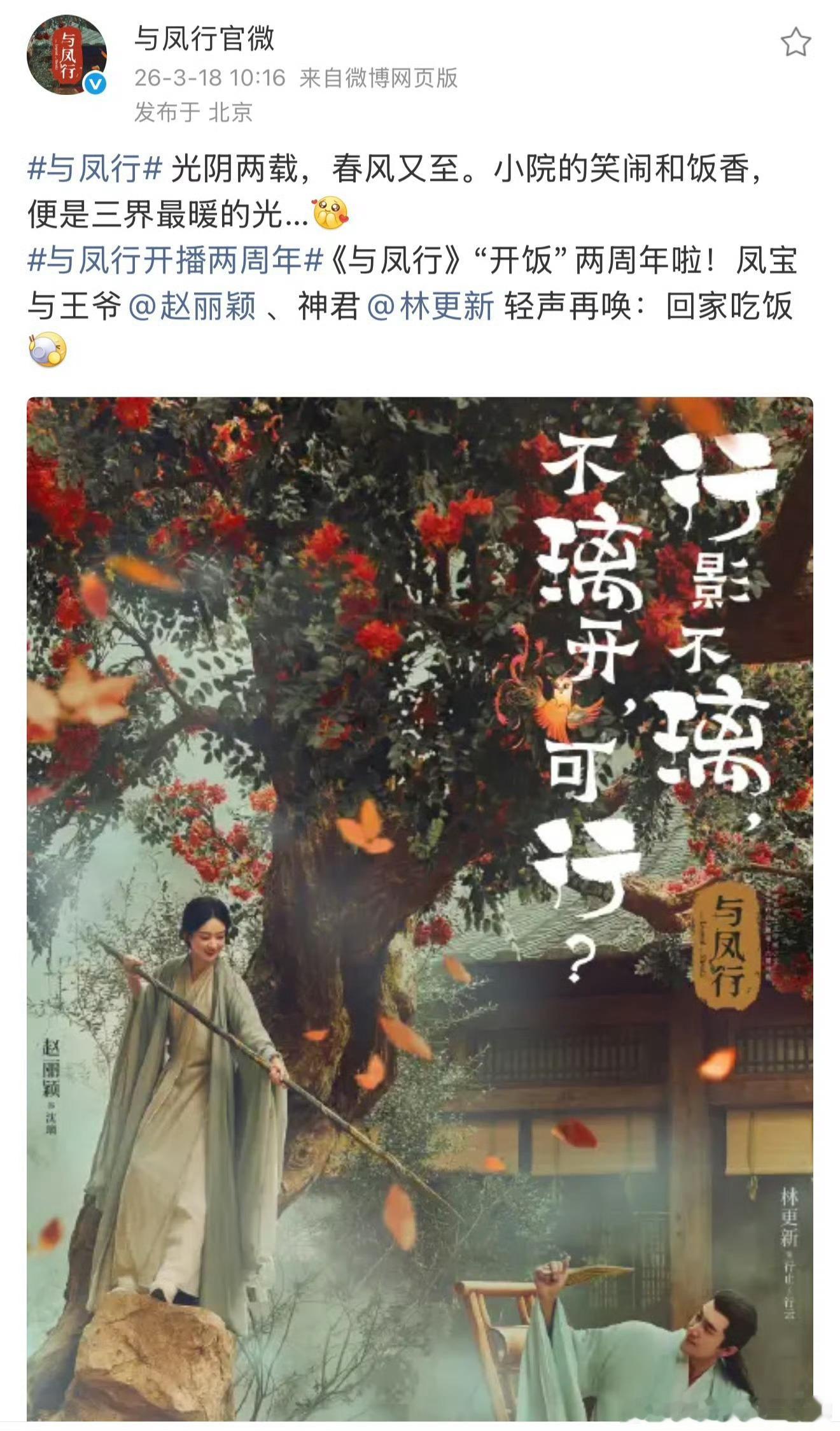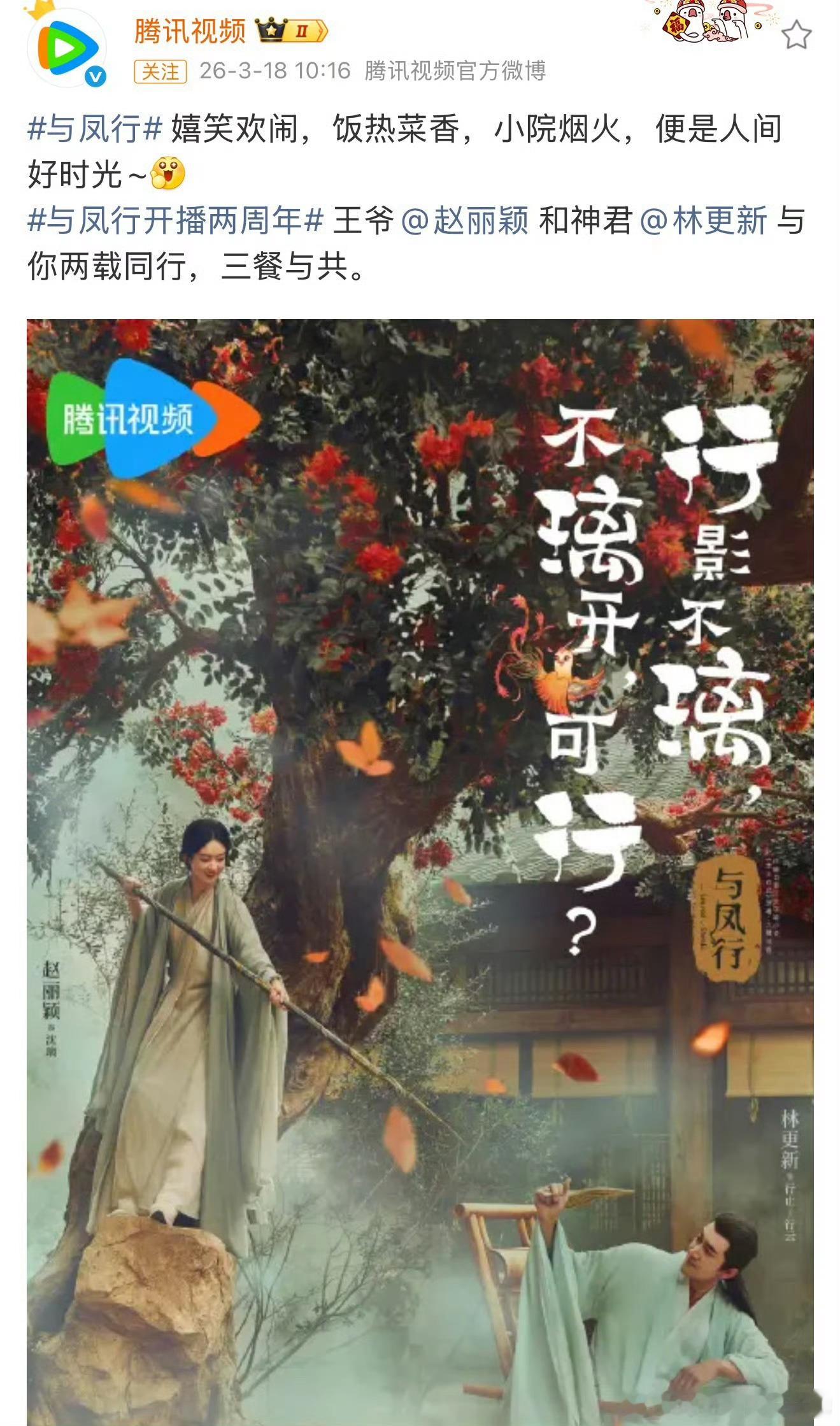 与凤行开播两周年时光流转,碧苍王沈璃与神君行止的三界爱恋依旧动人。赵丽颖×林更新二搭封神,双强人设飒爽带感,烟火仙侠氛围感拉满。开播两周年热度不减,名场面反复回味,爆款神话持续出圈,永远为凤止爱情心动!