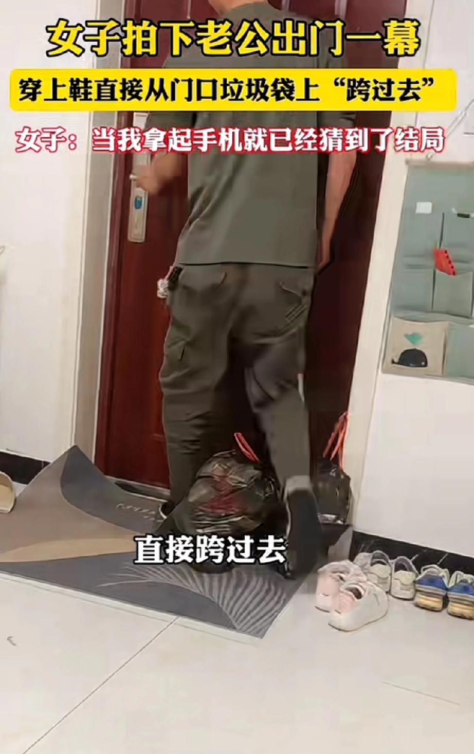 老公要出门,老婆为了测试老公,在门口放了两袋垃圾,果然,老公还是像往常一样穿好鞋子后,目不斜视的从门口垃圾上迈过去了。 妻子自嘲:当我拿起手机的时候已经猜到了结局。老公无视的不仅仅是垃圾,还有那么多年看不见的家务和妻子的辛苦。 结婚后,丈夫活的像个单身,妻子过的像个保姆,这样的婚姻挺常见的吧!