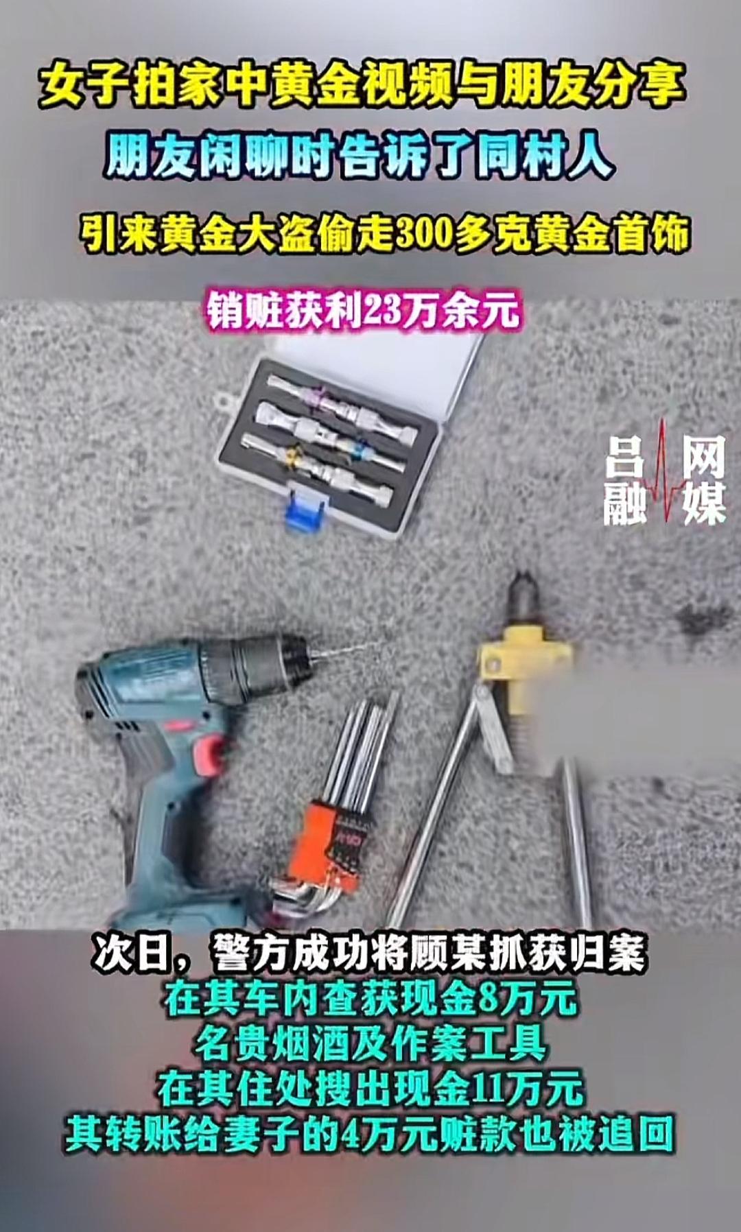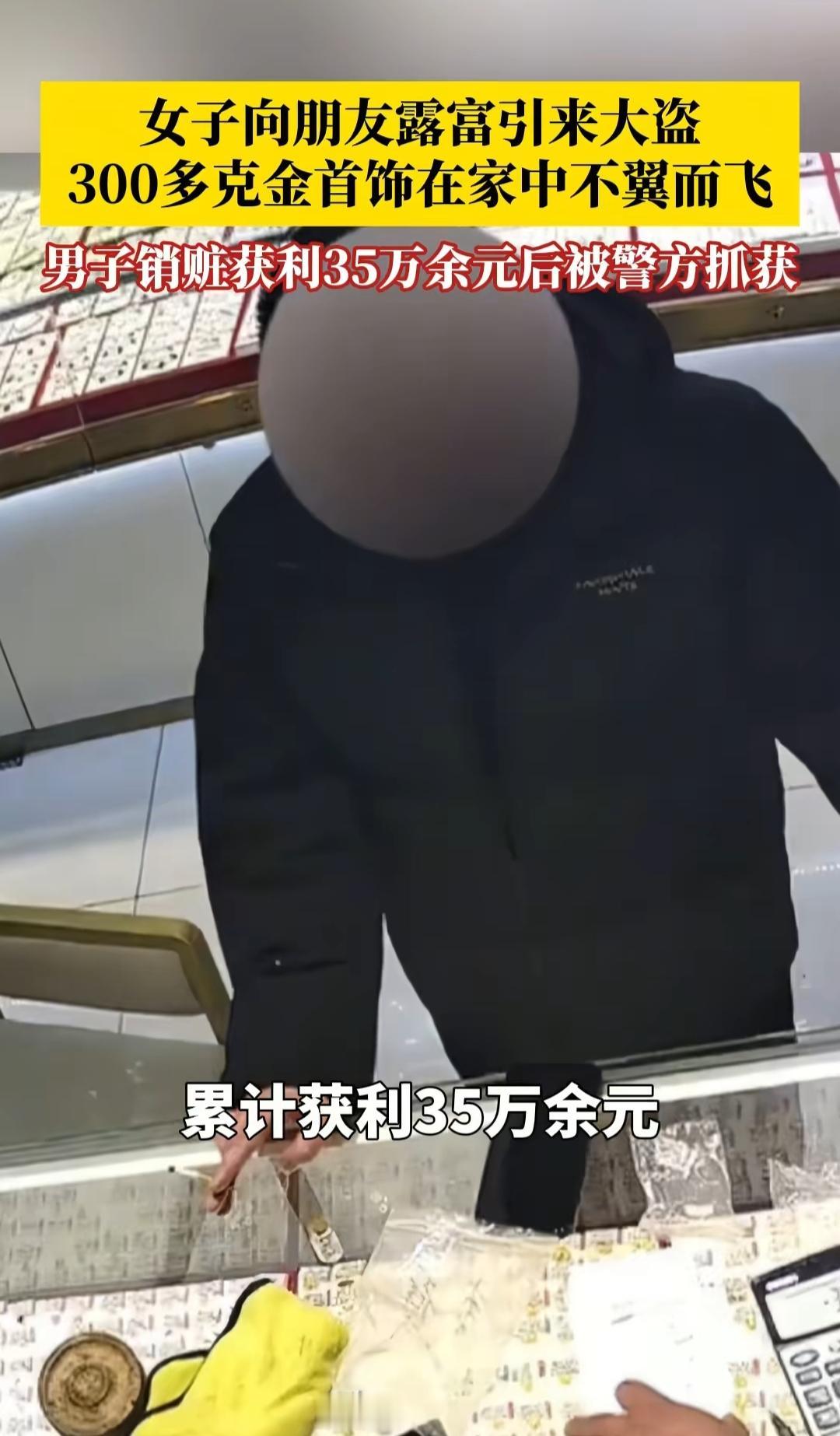 浙江台州,女子跟朋友闲聊时,随手拍了家中价值35万黄金的视频给朋友,没想到,朋友又告诉了同村的一男子,男子买了工具,潜入女子家中,将300多克黄金全部盗走,立马卖了35余万。女子发现黄金不见了,直接崩溃报警,男子结局太解气! 王女士回到家,一打开房门就浑身发凉。 门锁被人撬开,家里被人翻动过,她藏得好好的黄金不翼而飞。 300多克黄金,价值35万,一夜之间全都没了。 王女士又急又怕,饭也吃不下,觉也睡不着,整个人憔悴不堪。 她怎么也想不通,黄金藏得那么隐蔽,外人根本不可能知道,小偷究竟是怎么盯上她家的? 巨大的打击之下,她强撑着情绪,立刻报警。 随着警方调查一步步深入,整件事的真相,才慢慢浮出水面,竟然是王女士自己一次无心的炫富。 原来不久前,王女士和朋友闲聊时,一时得意,随手拍下了家中黄金的视频发给对方。 她以为只是私下分享,却没料到,朋友在和同村的顾某闲聊时,无意间提起了这件事。 顾某没有正当职业,本就游手好闲,加上喜欢买名贵东西装酷,一听说王女士家里有价值几十万的黄金,瞬间心生贪念。 他悄悄买好撬锁工具,摸清王女士的出行规律,趁家中无人,直接潜入室内,将300多克黄金全部盗走。 顾某为了避免夜长梦多,转手就将黄金卖了35万余元。 他将8万现金放在车内,其余的11万放在了其他地方,再将4万转给了妻子,剩下的拿去买了名贵的烟酒。 顾某本以为做得天衣无缝,可天网恢恢,警方很快通过线索锁定了顾某,并将其抓获归案。 王女士也后悔不已,正是自己一次大意的炫耀,才引狼入室,酿成这场大祸。 顾某潜入王女士家中实施盗窃,属于入户盗窃。 入户盗窃不论盗窃数额多少,均构成盗窃罪;若同时满足“数额特别巨大”,量刑将进一步加重。 《刑法》第64条规定:犯罪分子违法所得的一切财物,应当予以追缴或者责令退赔;对被害人的合法财产,应当及时返还。 顾某将赃款用于存放车内、转给妻子、购买烟酒等行为,均属于非法处置赃款,不影响赃款的追缴性质。 若妻子明知是赃款仍接收,可能涉嫌掩饰、隐瞒犯罪所得罪;若不知情,警方仍可依法追缴该部分款项。 本案中,警方依法追缴全部赃款赃物,及时返还被害人王女士。 财不外露,古训至今有效。一次无心的炫耀、一条随意发出的视频,都可能被别有用心之人盯上,最终引狼入室、酿成大祸。