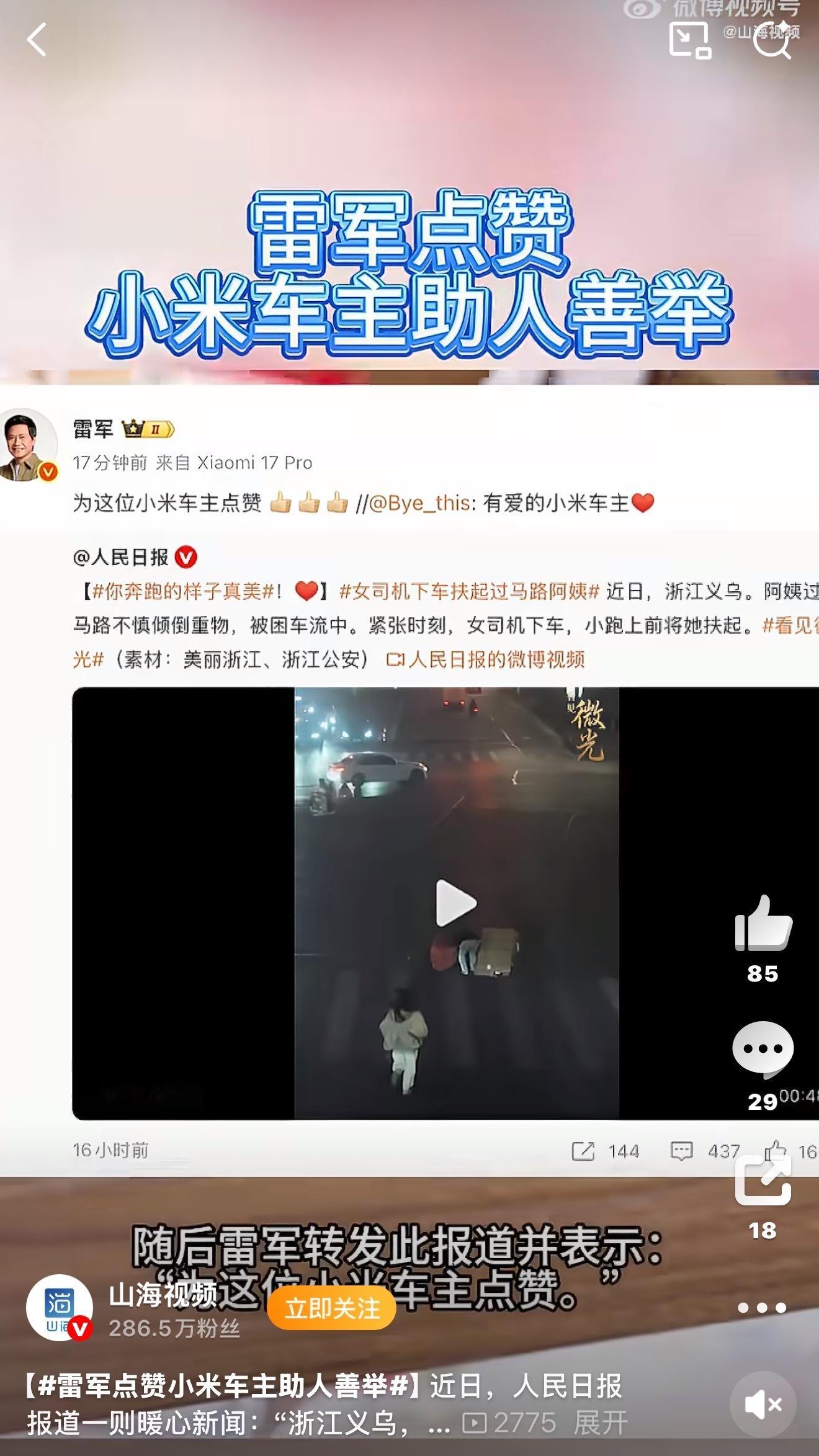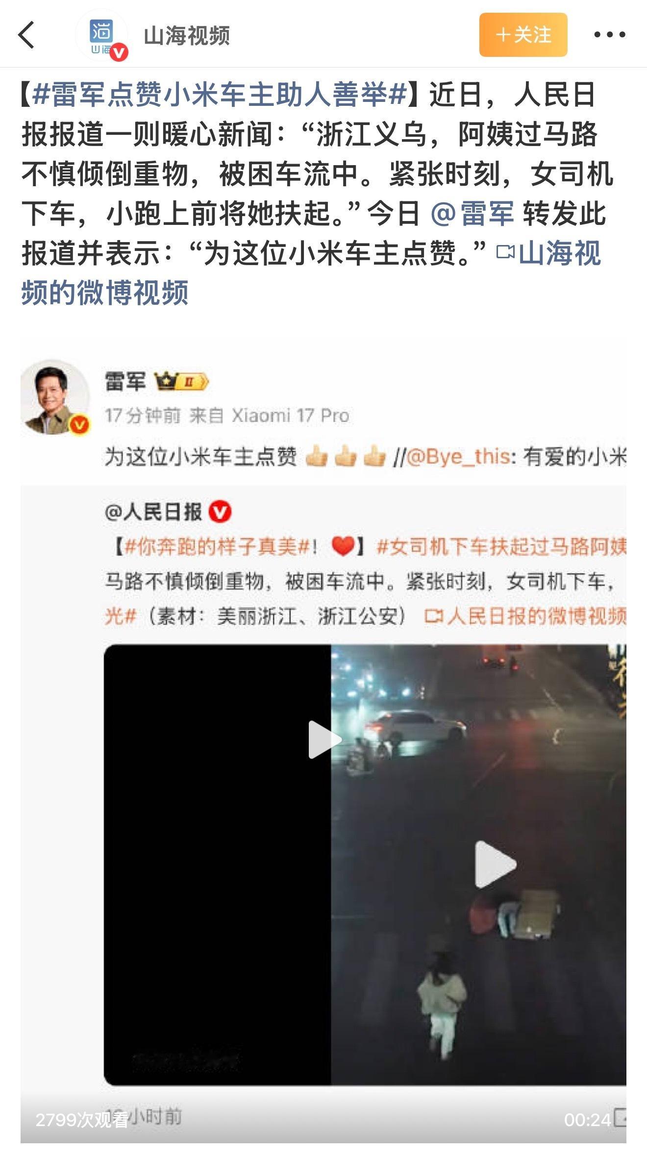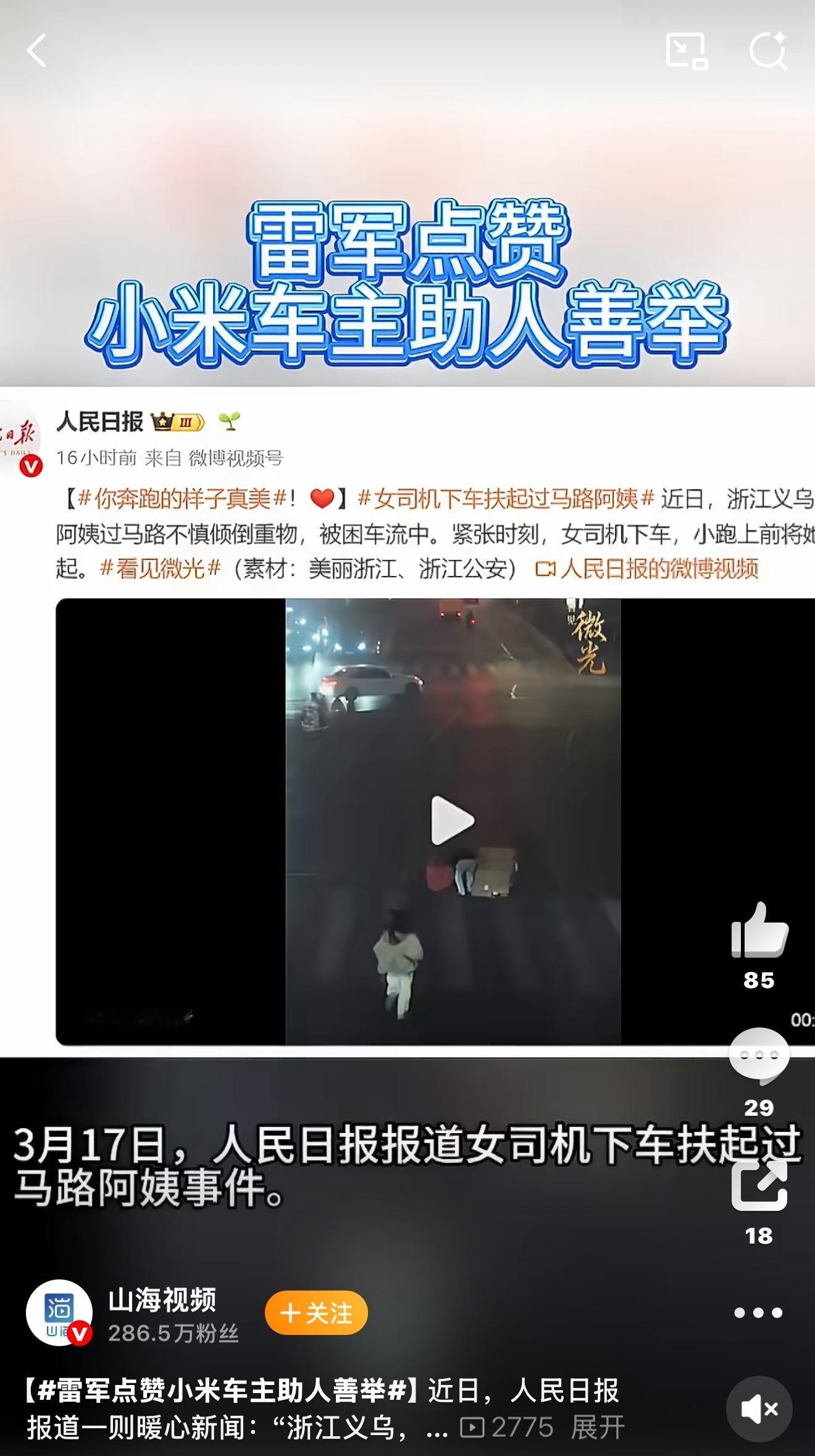 晚高峰的义乌街头有位阿姨带着重物摔倒在车流里,进退两难的时刻,这位小米女司机没有丝毫犹豫,立刻停车小跑上前,把人扶到了安全地带~人民日报为这份善意发声,雷总也专门为这位车主的行为转发点赞,我相信我们所有有善意的人,遇到这种情况都会做出同样的选择,只要我们人人献出一点爱,这个世界会变得越来越美好~雷军点赞小米车主助人善举