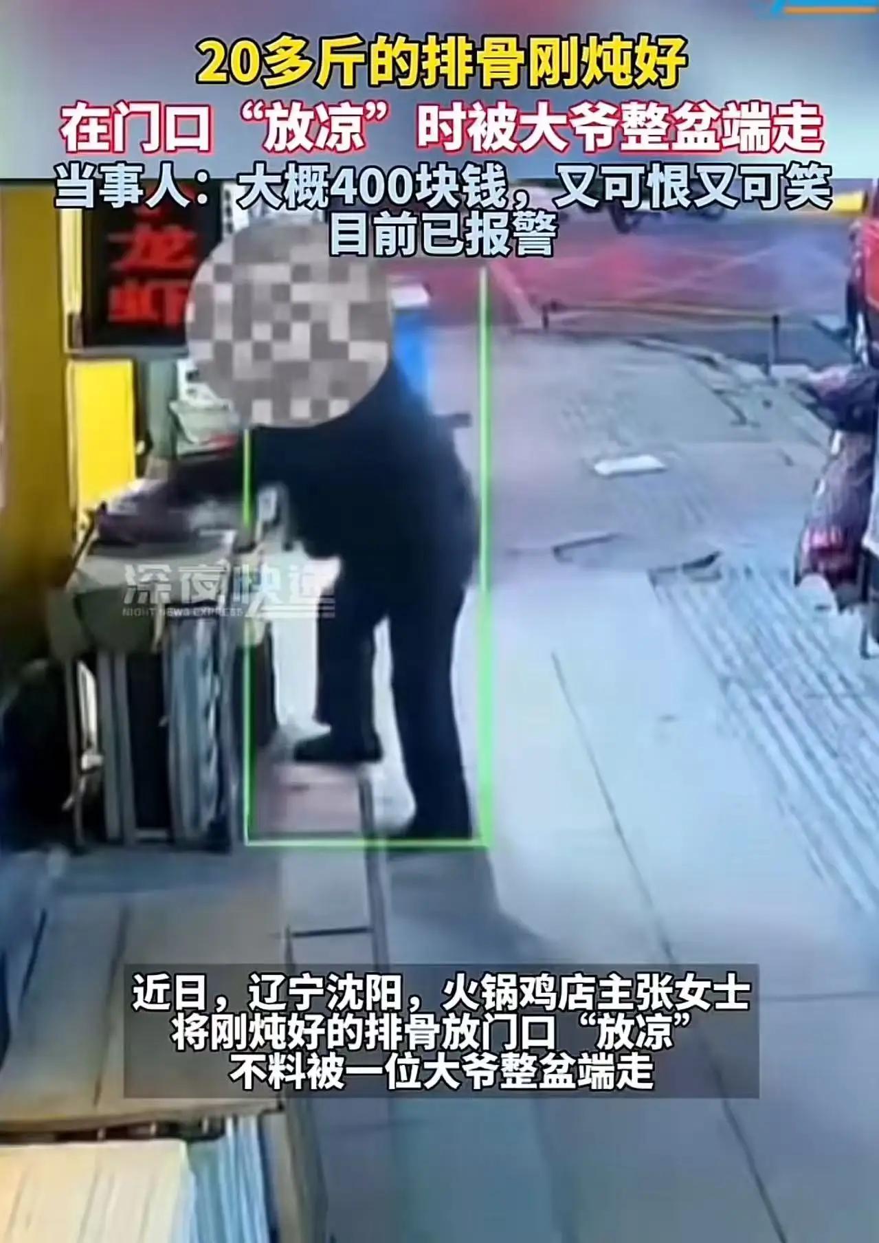 “不占便宜就浑身难受?”辽宁沈阳,一女子刚炖好40斤排骨,将其中20多斤放在门口放凉,没想到一会儿的功夫,排骨就被一位大爷连吃带拿一锅端走!但大爷万万没想到,店门口有监控,让他“晚节不保”! 不占便宜就浑身难受?辽宁沈阳女子刚炖40斤排骨,放门口凉一会儿,竟被大爷连吃带拿一锅端!监控一查,彻底晚节不保! 辽宁沈阳,一家小店门口,上演了一幕让人又气又笑的闹剧。 女子辛辛苦苦炖好了整整40斤排骨,香气扑鼻,肉质软烂。因为刚出锅太烫,她便先把其中20多斤盛出来,放在门口通风处晾凉,想着等温度合适了再收进去。 她以为就是转身几分钟的事,光天化日之下,总不会出什么岔子。 可现实偏偏打脸。 等她再出来时,眼前一幕让她当场愣住: 满满一大盆排骨,几乎被人连吃带拿,一锅端空了! 地上散落着骨头,盆里所剩无几,明显是有人蹲在门口,一边吃一边往袋子里装,一点都没客气。 女子又气又懵:这可是自己做生意要用的食材,不是没人要的东西,怎么有人好意思直接上手偷拿? 她立刻调取了门口监控,画面一出,所有人都看呆了。 拿走排骨的,是一位头发花白的大爷。 只见大爷慢悠悠走到门口,看见一大盆热气腾腾的排骨,眼睛一亮,左右张望了一下,确认没人注意,便开始了一连串操作: 先是直接用手抓着吃,吃得津津有味,吃完一块又一块。 吃够了还不满足,又从身上掏出袋子,大把大把往袋子里装,装得满满当当,直到把盆里搬得差不多,才心满意足地离开。 整个过程熟练自然,仿佛这排骨本来就是他的。 女子看到监控,气得哭笑不得。 她不是心疼那点排骨,而是寒心: 这么大年纪,本该是受人尊敬的长辈,怎么能做出这种顺手牵羊、白吃白拿的事? 20多斤排骨,说多不多,说少不少,但这不是占便宜的理由。 店家安安稳稳做生意,勤勤恳恳炖肉,一没挡路,二没扰民,就因为放在门口凉一会儿,就被人当成“免费自助餐”,连吃带拿一扫而空。 更让人无语的是,大爷从头到尾没有一丝犹豫和愧疚,吃得坦然,拿得大方,好像不占这个便宜,自己就亏大了。 这事传到网上,瞬间炸锅。 网友们纷纷评论: “不是老人变坏了,是坏人变老了。” “想吃可以问一句,人家说不定还能送你几块,这么偷拿太难看。” “一把年纪,为了点排骨,把脸面都丢光了。” 大家气愤的,从来不是那几块肉,而是这种自私自利、爱占便宜、毫无底线的行为。 生活里,这种人真的不少见。 看到别人放门口的快递,顺手摸走; 看到店里摆外面的东西,悄悄拿一点; 看到没人看管的食材,觉得不吃白不吃。 他们总抱着一种心理: 反正没人看见,反正不值多少钱,反正不拿白不拿。 却从来不想: 别人的东西,再小也是别人辛苦换来的; 占一次小便宜,丢的是一辈子的人品; 监控无处不在,一时的贪心,只会让自己晚节不保,颜面尽失。 这位大爷大概也没想到,自己只是想贪点小便宜,结果被监控拍得一清二楚。 为了一口吃的,把尊严、脸面、口碑,全都搭了进去。 真的值得吗? 其实,人与人之间最舒服的关系,是不占便宜、守好本分、懂得尊重。 别人的善意,不是你放肆的理由; 别人的疏忽,不是你偷窃的借口。 穷不可怕,苦不可怕,最可怕的是,年纪一大把,格局小得可怜,人品差得离谱。 我们尊重老人,尊重的是德行,不是年龄; 我们体谅不易,体谅的是善良,不是贪心。 希望这件事,能给所有人提个醒: 小便宜占得再多,也发不了财; 人品一旦塌了,才是真的一无所有。 别因为一点蝇头小利,丢了做人最基本的脸面。 做人,干干净净,本本分分,比什么都强。 你觉得,这位大爷该不该为自己的行为负责? 评论区说说你的看法! 聊聊那些“说了但又没说”的话 你认为善良的人会幸福吗?