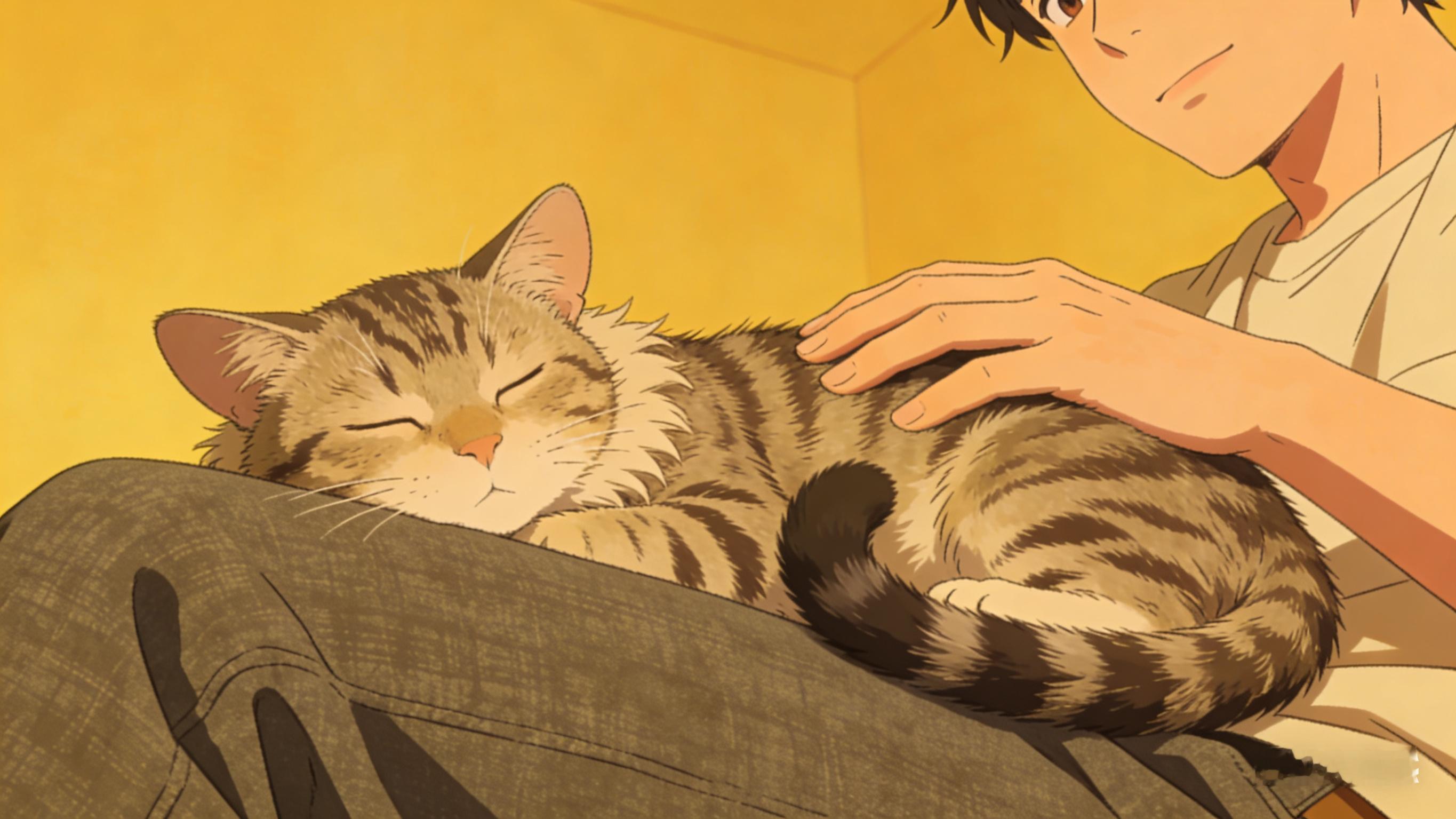 狸花猫趴在陌生男子腿上甜甜入睡 能多点这种给温顺的小猫小狗进店吃饭的店铺就好了。