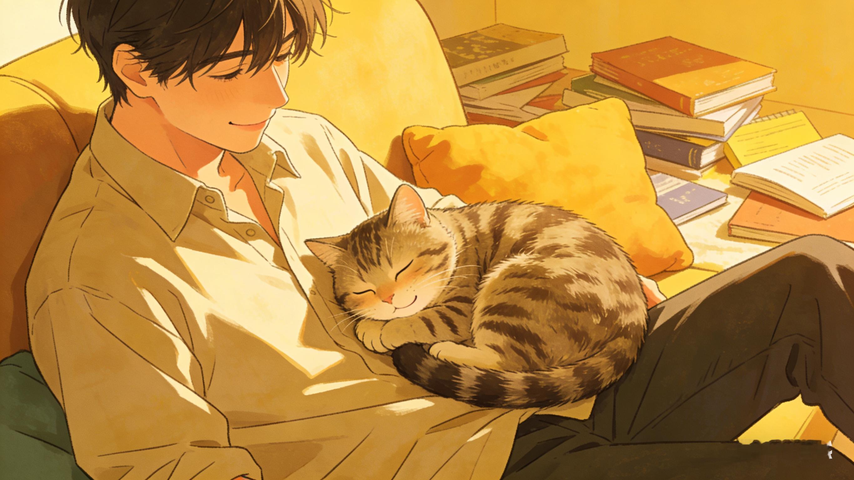 狸花猫趴在陌生男子腿上甜甜入睡 能多点这种给温顺的小猫小狗进店吃饭的店铺就好了。好多地方都不允许动物进内,有时候遛狗想进去买点东西或者吃点东西就很不方便。