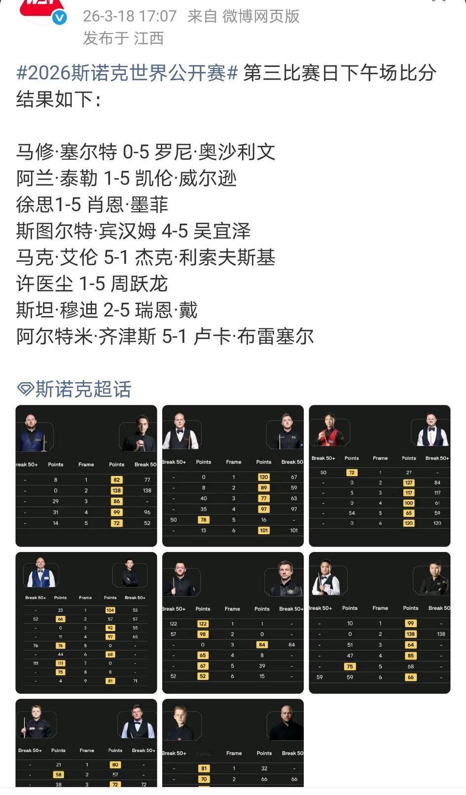 火箭强势归来!奥沙利文零封对手晋级16强。2026斯诺克玉山公开赛32进16轮次,今天下午比赛结束,2名中国球员晋级。 奥沙利文5-0塞尔特 囧哥5-1泰勒 墨菲5-1徐思 吴宜泽5-4宾汉姆 周跃龙5-1许医尘 ……