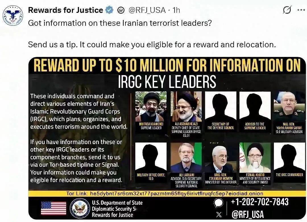 美国国务院在其 “正义奖励计划”里,悬赏1000万美元奖励能提供与革命卫队有关阿亚图拉政权高级成员的信息者,还可获得移民击毁,而被悬赏的这些人里,就包括拉里贾尼,这也是以色列外长为什么说免费为美国政府杀死了拉里贾尼的原因。