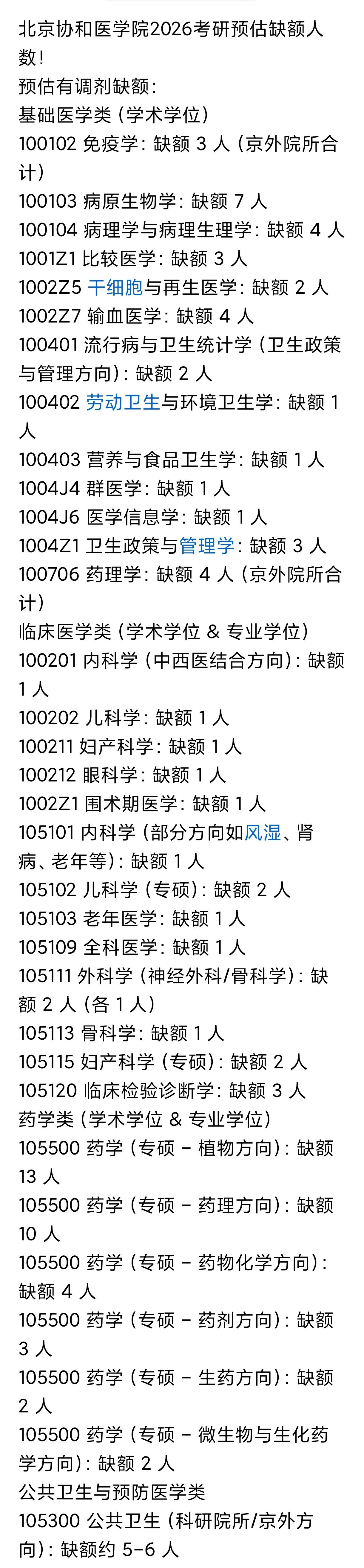 你敢相信,协和医学院考研上线人数不足还需要调剂?这还真是事实,需要调剂的人数还不少呢。 医学圈很多人都知道了北京协和医学院2026考研需要调剂,预估有调剂缺额的来自多个专业,比较典型的有: 105102 儿科学(专硕):缺额 2 人 105115 妇产科学(专硕):缺额 2 人 105111 外科学(神经外科/骨科学):缺额 2 人(各 1 人) 你说儿科学和妇科学缺人我还能理解,外科学也缺人这个真不理解。 以前我们经常说“协和的儿科也是协和”,如今可能更多的是“协和的儿科还是儿科”,就跟北大的护理专业一样。 随着医保改革、医患关系以及规培制度的等多重因素影响,加上生育意愿降低,未来几年医学的热度只会越来越冷。国家需要适度采取措施了,这么下去不行的。 协和医学院 考研调剂