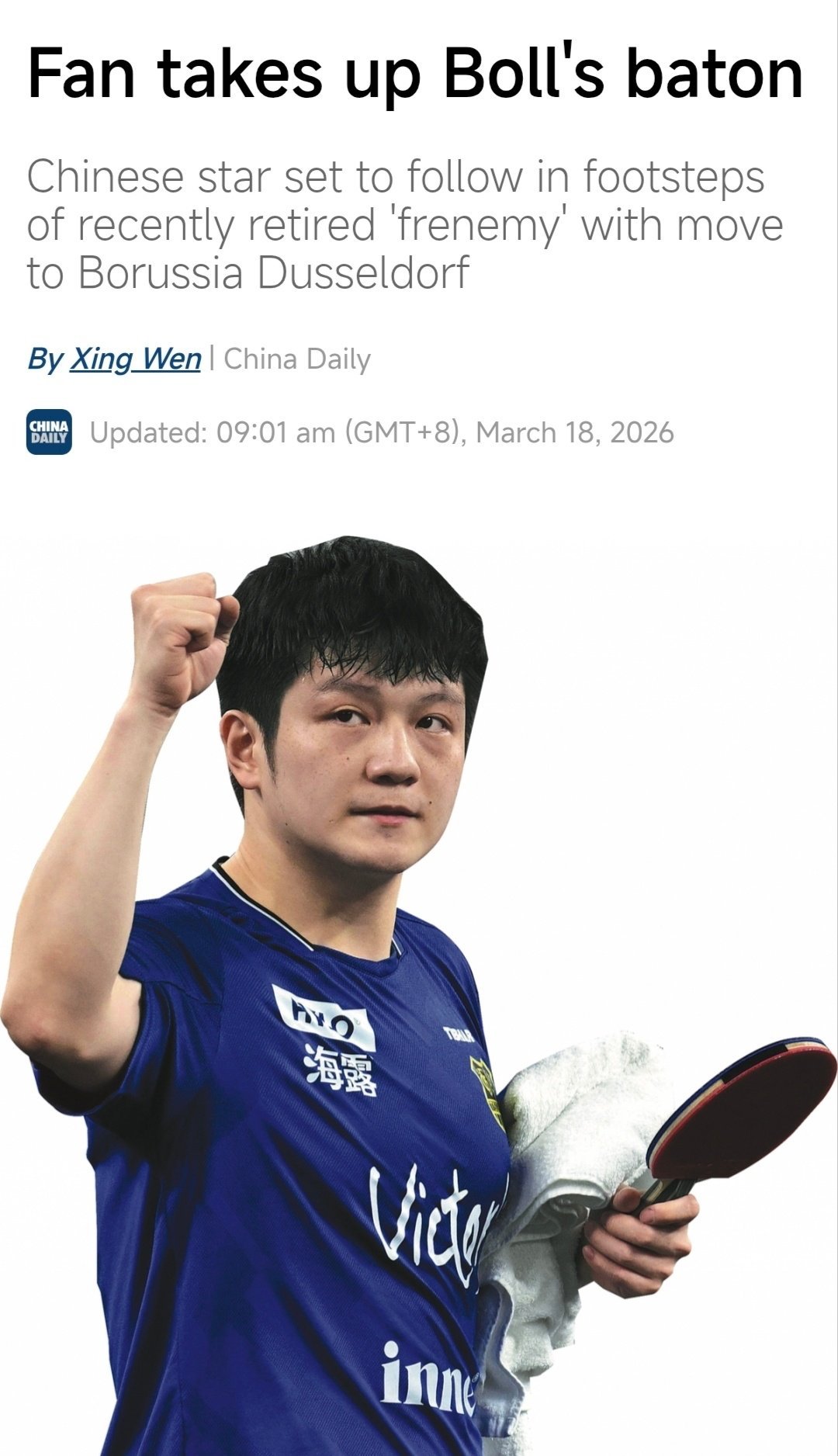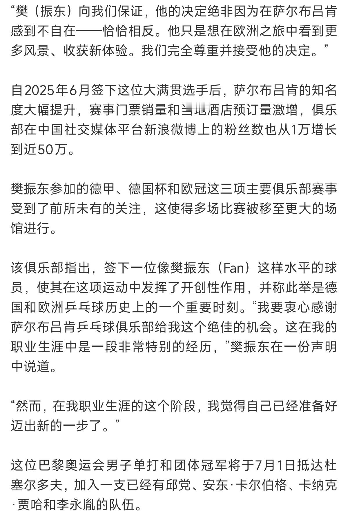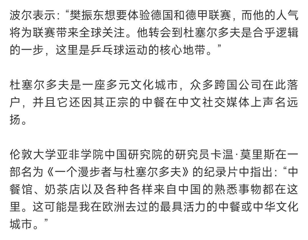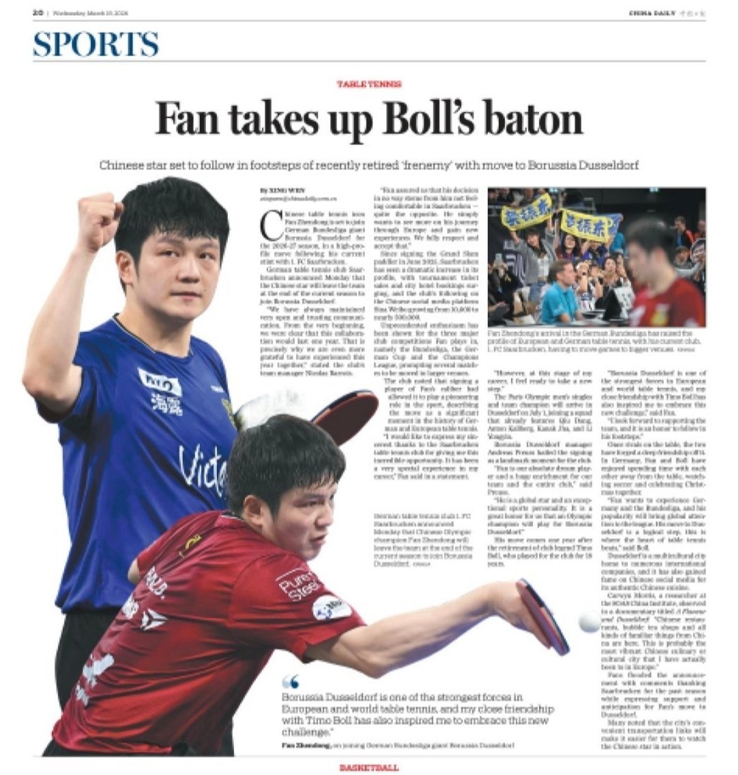 中国日报道关于樊振东转会杜塞尔多夫俱乐部消息。樊振东被赞是中国乒乓球标志性的人物,中德文化交流友谊使者。也被杜塞尔多夫盛赞到有了樊振东的到来对我们来说是最大的荣誉。 这是樊振东一拍拍,一场场以硬实力与大格局赢得尊重!