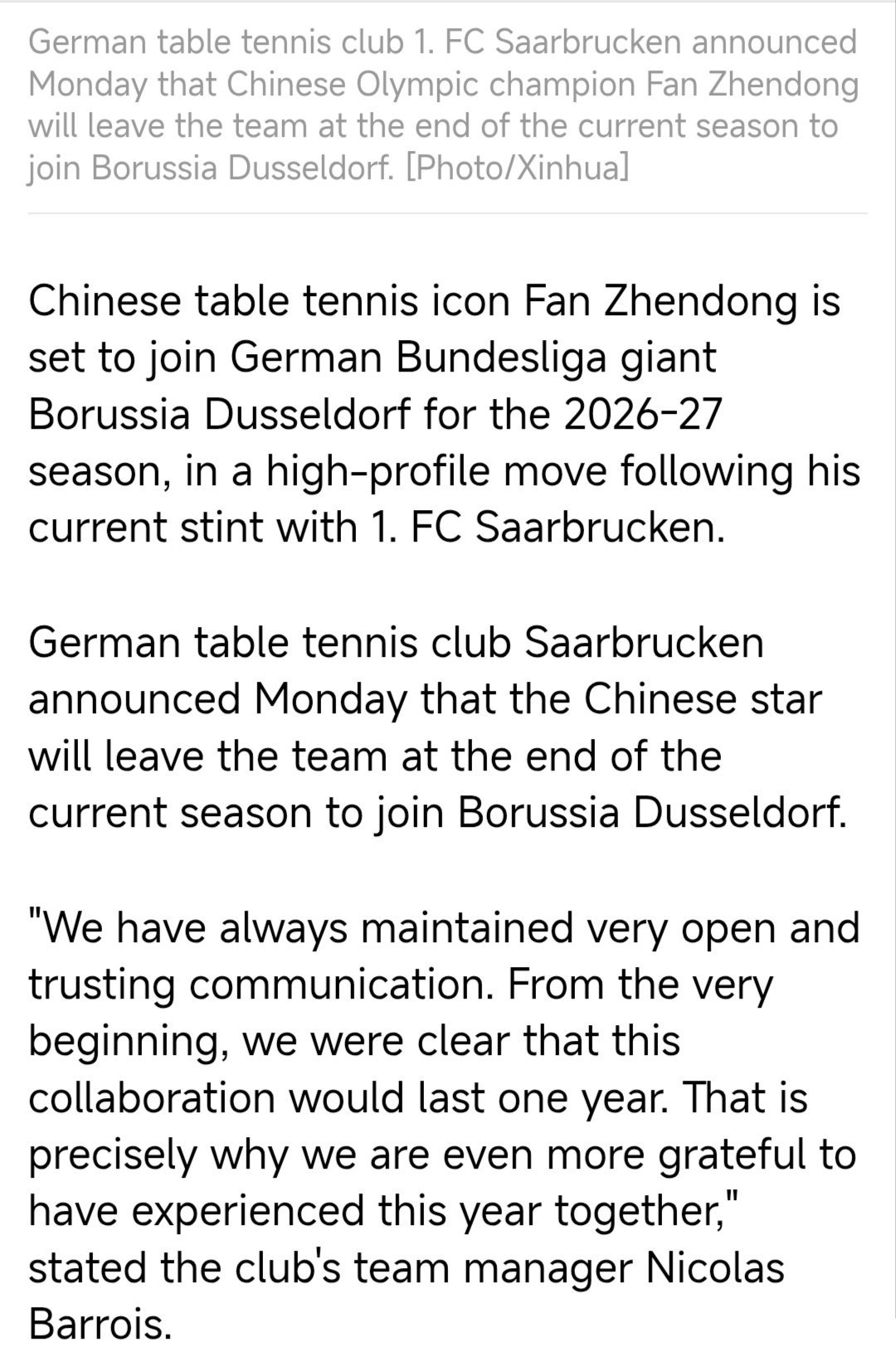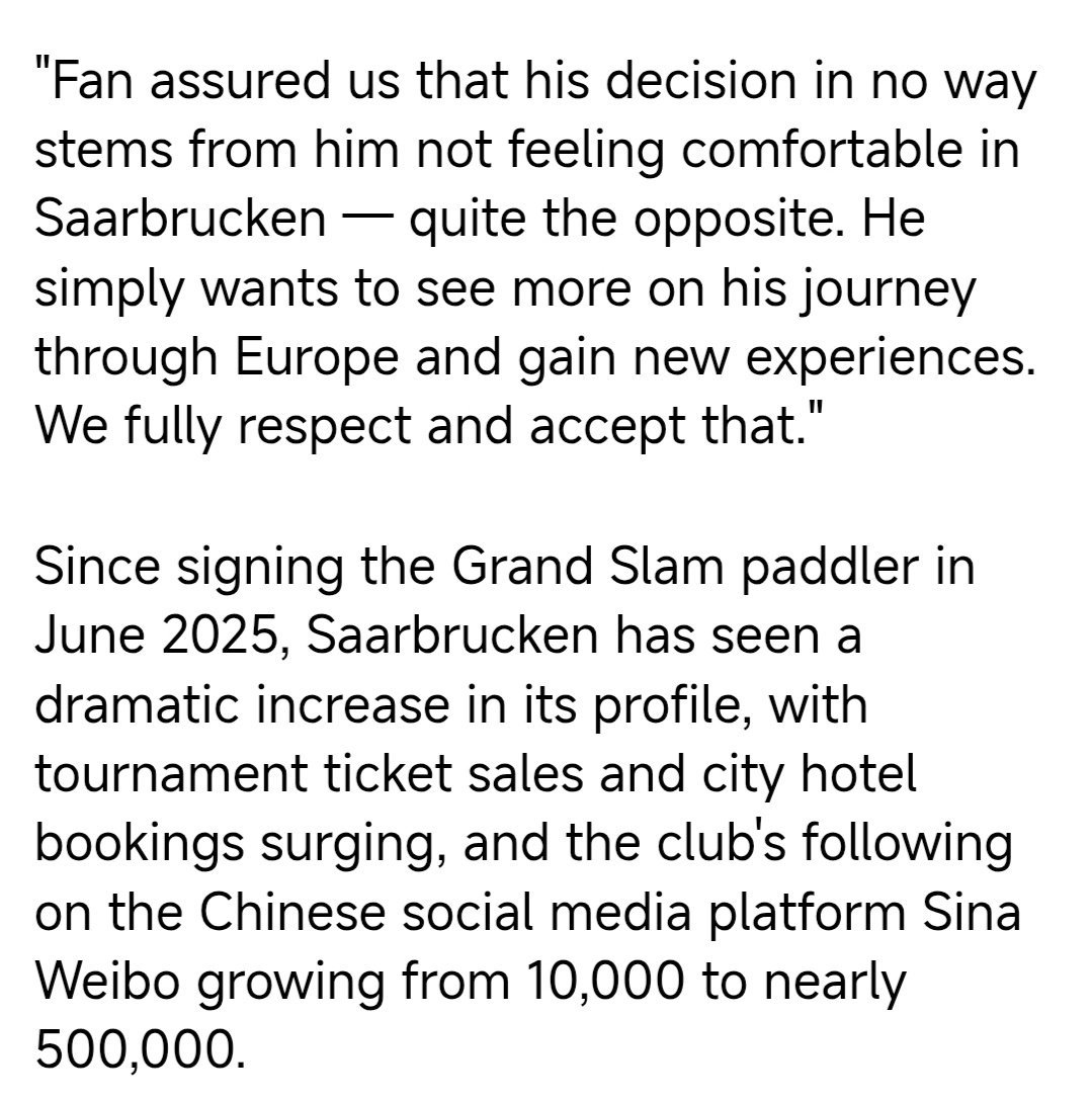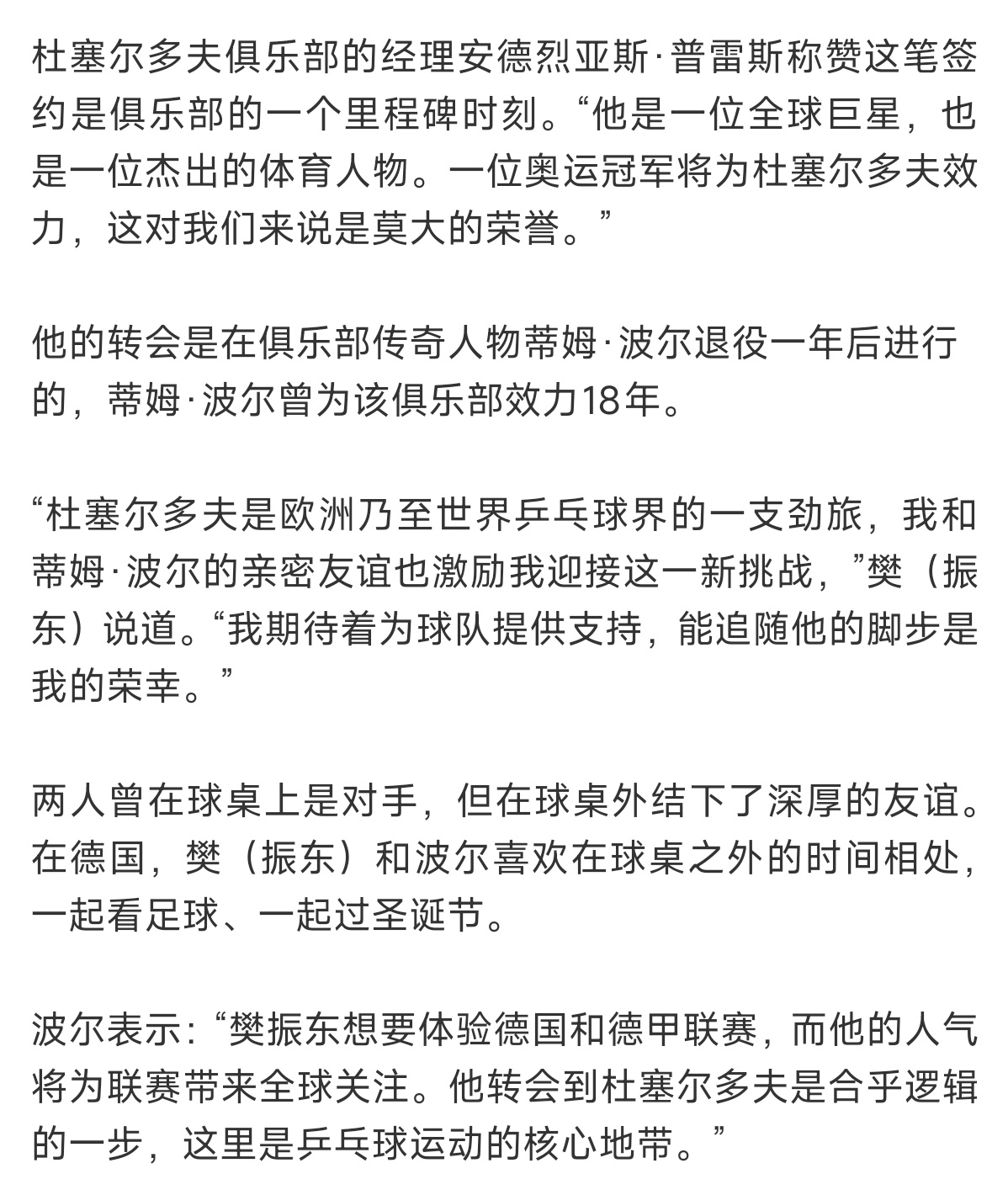 中国日报道关于樊振东转会杜塞尔多夫俱乐部消息。樊振东被赞是中国乒乓球标志性的人物,中德文化交流友谊使者。也被杜塞尔多夫盛赞到有了樊振东的到来对我们来说是最大的荣誉。 这是樊振东一拍拍,一场场以硬实力与大格局赢得尊重!