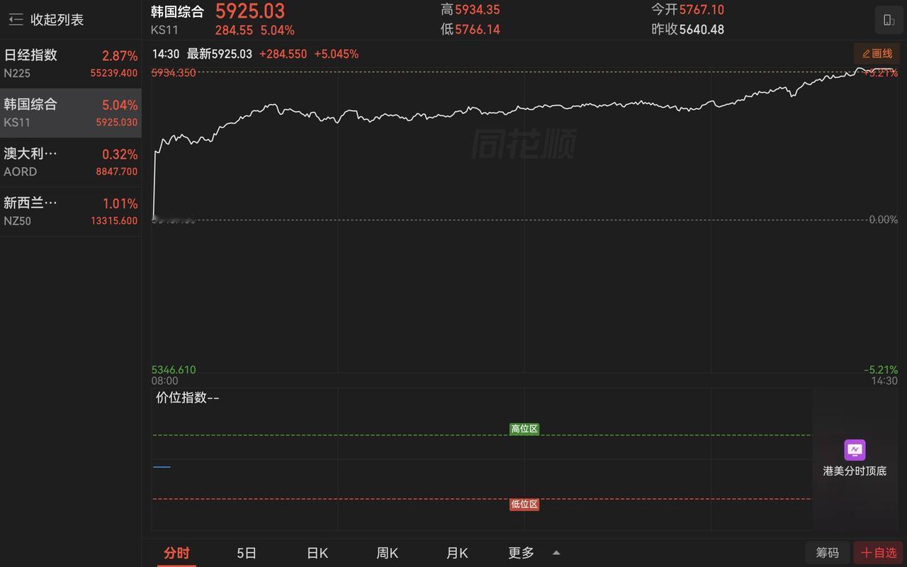 2026年3月18日, 韩国股市收盘后, 三星电子(005930.KS) 股价为208,500韩元(约合人民币966元), 当日涨幅约7.53%; SK海力士(000660.KS) 股价为1,056,000韩元(约合人民币4,890元), 当日涨幅约8.87%。 两股领涨韩国综合指数(KOSPI), 直接涨熔断了5.11%。 今年韩国股市涨幅全球第一, 从去年到现在全球涨幅遥遥领先。 受美伊战争影响前期调整不少, 但总是涨幅依然巨大, 监管层说必要时将扩大100万亿韩元市场稳定计划! 看来他们就不懂涨太多闹股灾。 跟大A 学习一下量化高频, 学一下怎么管理, 几十年在3000点打转, 涨个百十点就慌里慌张的, 迫不及待的打压。中日韩股市 日韩股市收盘 韩股指数 日韩股票 韩国股指 韩国股市收涨 韩股市场