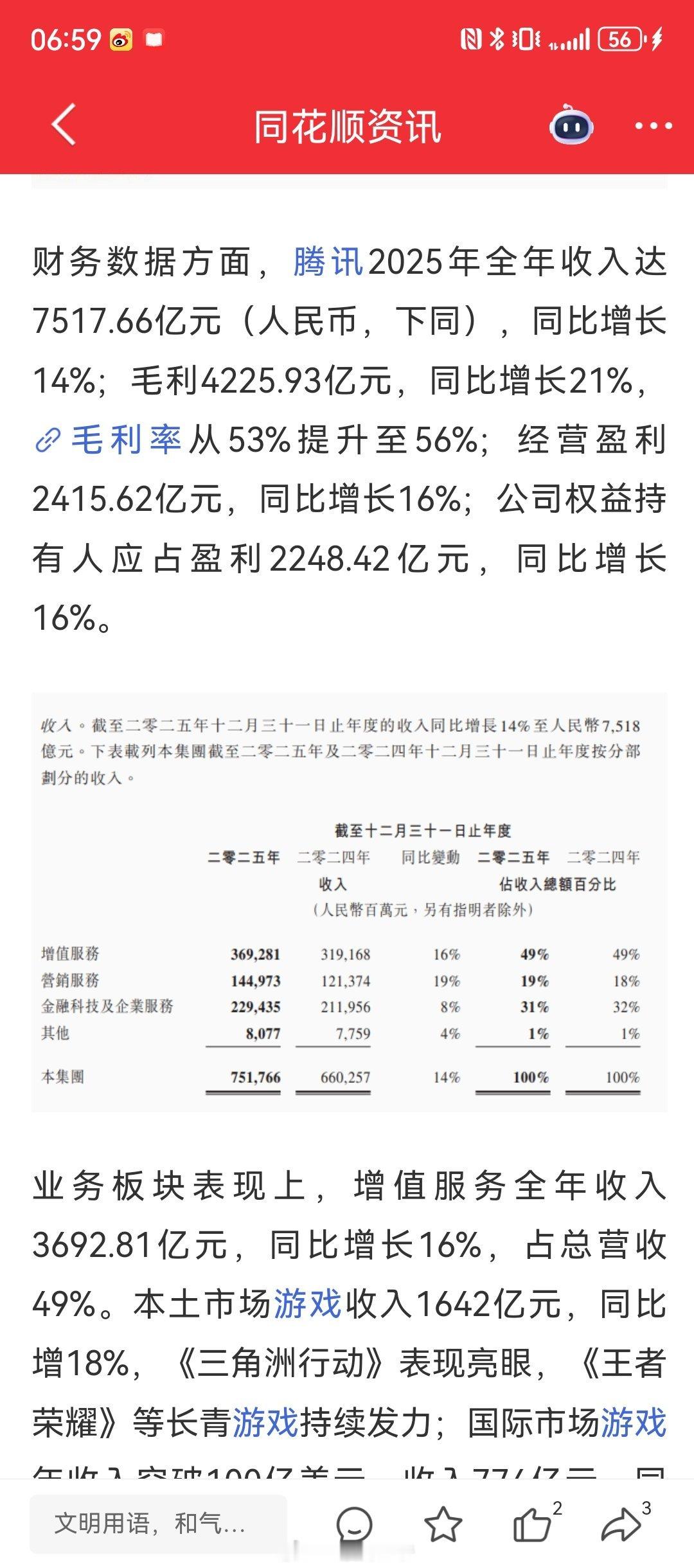 腾讯2025年全年收入达7517.66亿元(人民币,下同),同比增长14%;毛利4225.93亿元,同比增长21%,毛利率从53%提升至56%;经营盈利2415.62亿元,同比增长16%;公司权益持有人应占盈利2248.42亿元,同比增长16%。