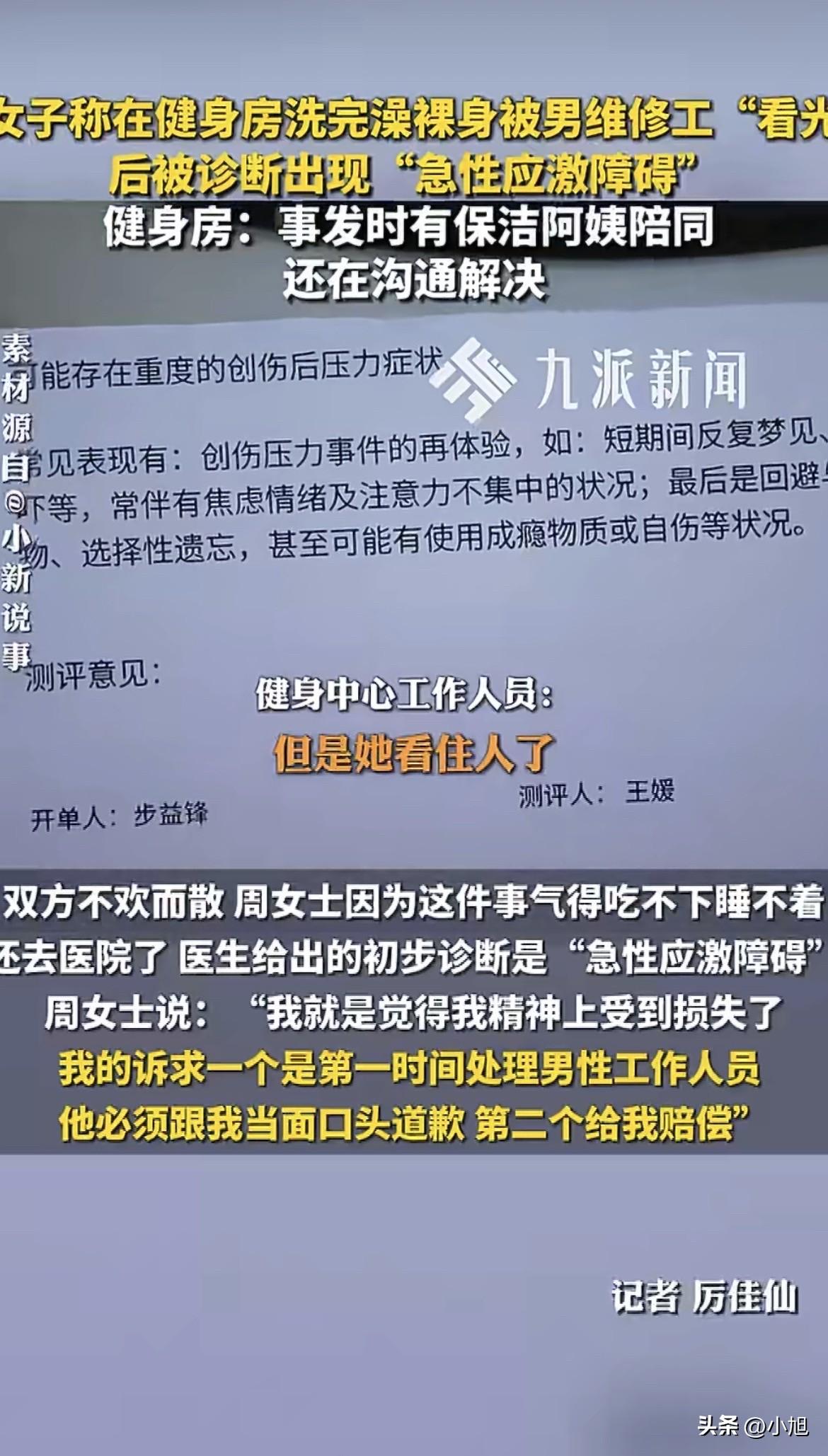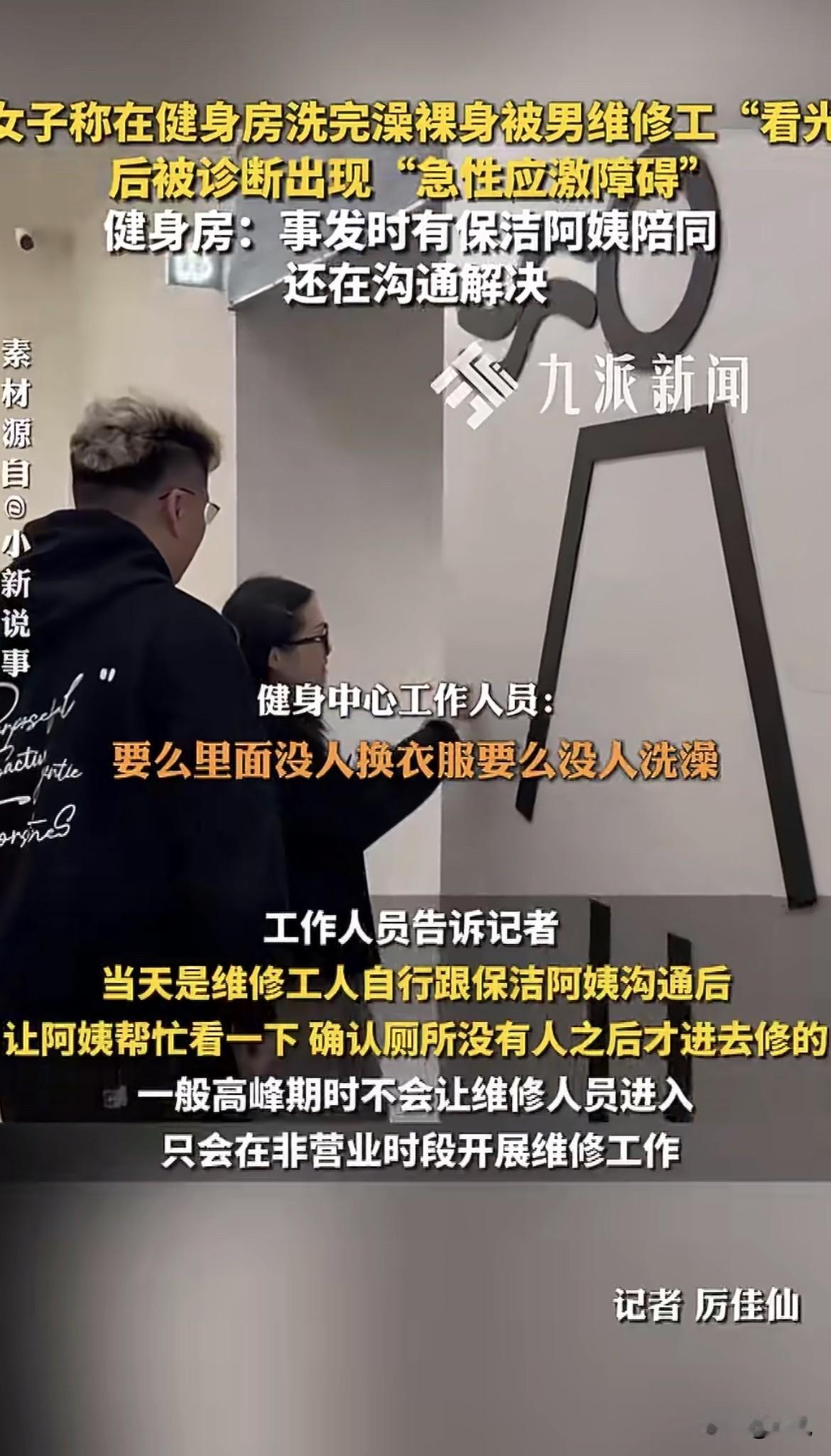晚上8点,周女士刚健完身,在女更衣室冲了个澡。她身上什么都没穿,推开浴室的门,准备拐到隔壁上厕所。就在走廊里,她猛地撞见一个陌生男人。两个人面对面,离得很近。周女士说,那一瞬间她整个人像被电打了一样,脑子里一片空白,本能地转身就逃。她后来回想,那个男人穿着黑上衣,裤子是淡颜色的,她看得清清楚楚。 周女士逃回更衣室,浑身发抖。她后来才知道,这个男人是来修厕所管道的。让她想不通的是,女更衣室这种地方,让男维修工进来,居然没有任何人通知她一声。当时里面还有好几个人在吹头发,大家根本不知道有个男人进来了。 第二天周女士去找健身房讨说法。店里的答复让她更难受。负责人说,这事跟周女士描述的根本不是一回事。维修工进去的时候,特意叫了保洁阿姨跟着,让阿姨在拐角处看着,先把厕所里面的人清空了才让工人进的。保洁阿姨也作证,工人修好走了之后,周女士才从更衣室出来。 负责人还透露了一个细节:当时周女士出来上厕所,保洁阿姨多嘴说了一句“现在可以上了,刚修管道的工作人员已经走了”。周女士一听这话,当场就炸了。 现在两边说法完全对不上。周女士坚持说跟维修工面对面撞见了,对方穿什么颜色的裤子她都记得清清楚楚。健身房坚称两个人根本就没碰上,是保洁阿姨那句话惹的祸。更衣区又没监控,这事成了一个死结。 周女士说,这件事之后她整个人都垮了,吃不下睡不着,去医院一看,医生诊断是“急性应激障碍”。她当时质问健身房的那句话,现在听起来都让人心里发堵:“我犯了什么天条了?我到底是犯了什么罪了?我到底是怎么了?为什么还要我来给你们来主动去解决这个事情,不应该你们来主动跟我解决这些事情吗?” 律师陈朱光分析了这件事。哪怕双方各执一词,有一点是绕不开的:健身房在没有通知所有女会员的情况下,就让男维修工进了女子区域。就算派了保洁阿姨跟着,可阿姨只能看着维修工,保证不了不会有女会员从更衣室出来上厕所。这种管理方式,本身就是漏洞。如果最后证实周女士确实被看到了,健身房没尽到安全保障义务,该赔的精神损失费一分都跑不掉。 周女士已经报了警。警察调了监控,监控确实拍到保洁阿姨带着维修工进了女子区域。但监控能不能拍到两个人有没有打照面,还得等警察进一步调查。 这事背后藏着一个更深的问题。健身房负责人反复强调“我们让保洁阿姨看着呢”“工人走了她才出来的”,这种辩解听起来像是在说:只要我们的流程走对了,责任就尽到了。可问题是,周女士在乎的真的是那个维修工长什么样、到底看了几秒吗?她在乎的是,自己光着身子从浴室出来的时候,心里以为这是绝对安全的空间,结果这个空间早就被打破了,只是没人告诉她。 律师陈朱光还提到一个关键点:消费者维权时,应当对侵权事实承担举证责任,如果没有证据证明隐私权遭到侵害的,可能对其后期维权产生障碍。这话翻译成大白话就是:被看了你得拿出证据来。可更衣室门口怎么可能装监控?这就成了一个死循环——越是私密的地方,出了事越难证明,越难维权。 健身房的逻辑是“没碰上就不算事”,可周女士的逻辑是“你让男人进了女人脱衣服的地方,本身就是事”。这两种逻辑的冲突,才是这件事的核心。健身房的负责人到现在可能都没想明白,周女士要的不是证明那个维修工到底看没看见她,而是“我光着身子的时候,我的安全到底谁来负责”。 你觉得这件事,到底是周女士太敏感,还是健身房太不拿女会员当回事? 来源:嘉兴电视台《小新说事》、九派新闻