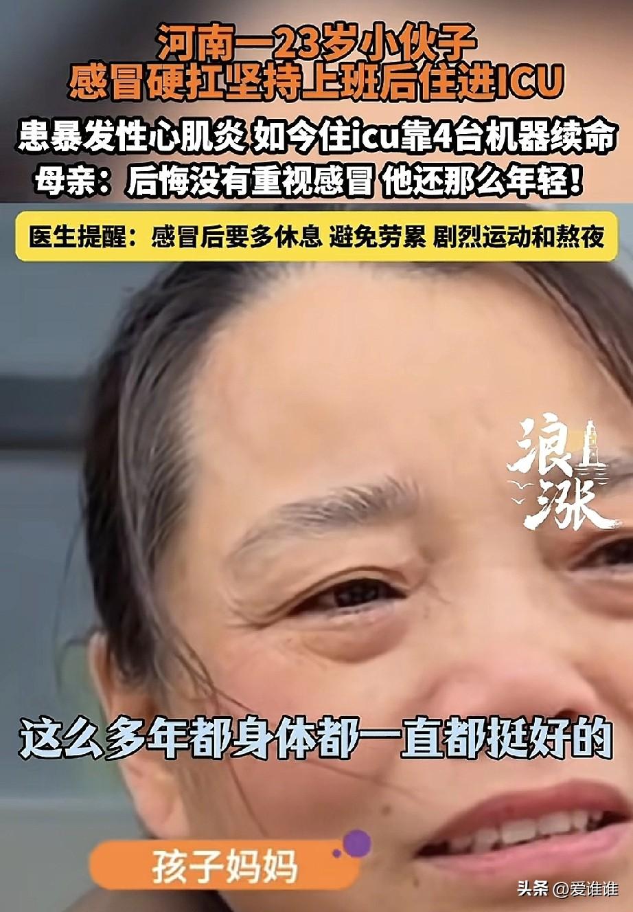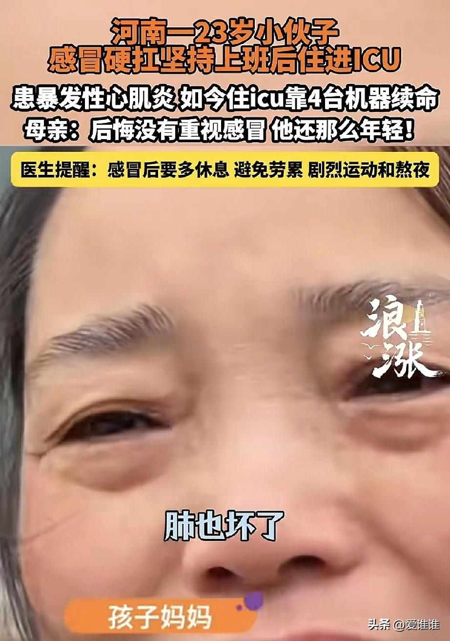 “惋惜!”河南商丘,23岁小伙上班期间感冒,觉得年轻扛一扛就过去了,在加上假也不好请,就照样上班,结果没几天,病情突然加重,胸闷、咳血,送到医院一查,已经是严重的心力衰竭和心肌炎,现在人躺在ICU里,全靠四台机器维持生命,心脏、肺都不行了,血液也得靠机器过滤。 他妈妈守在病房外,哭得不成样子,说孩子平时身体特别好,谁想到一场感冒搞成这样,她对着镜头喊,愿意把自己的心脏换给儿子,只要孩子能活下来,医生说,这种爆发性心肌炎非常凶险,偏偏最爱找年轻人,因为免疫力强反而反应过度,拖久了就没机会了。 网上很多人看完也叹气,说不是小伙子不想歇,是很多单位请假太难,怕扣钱、怕丢工作,奉劝各位:不管多忙多累,身体不对劲千万别硬撑,早去医院就是救自己,希望这个小伙能挺过来,也希望大家记住这个教训!